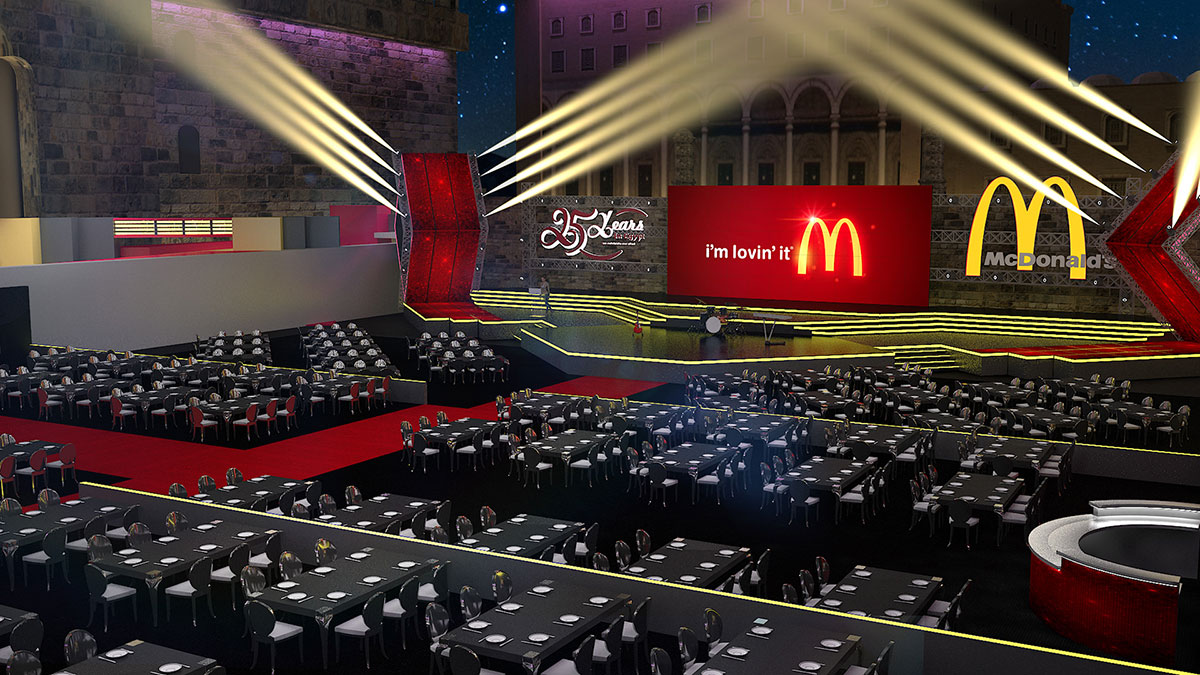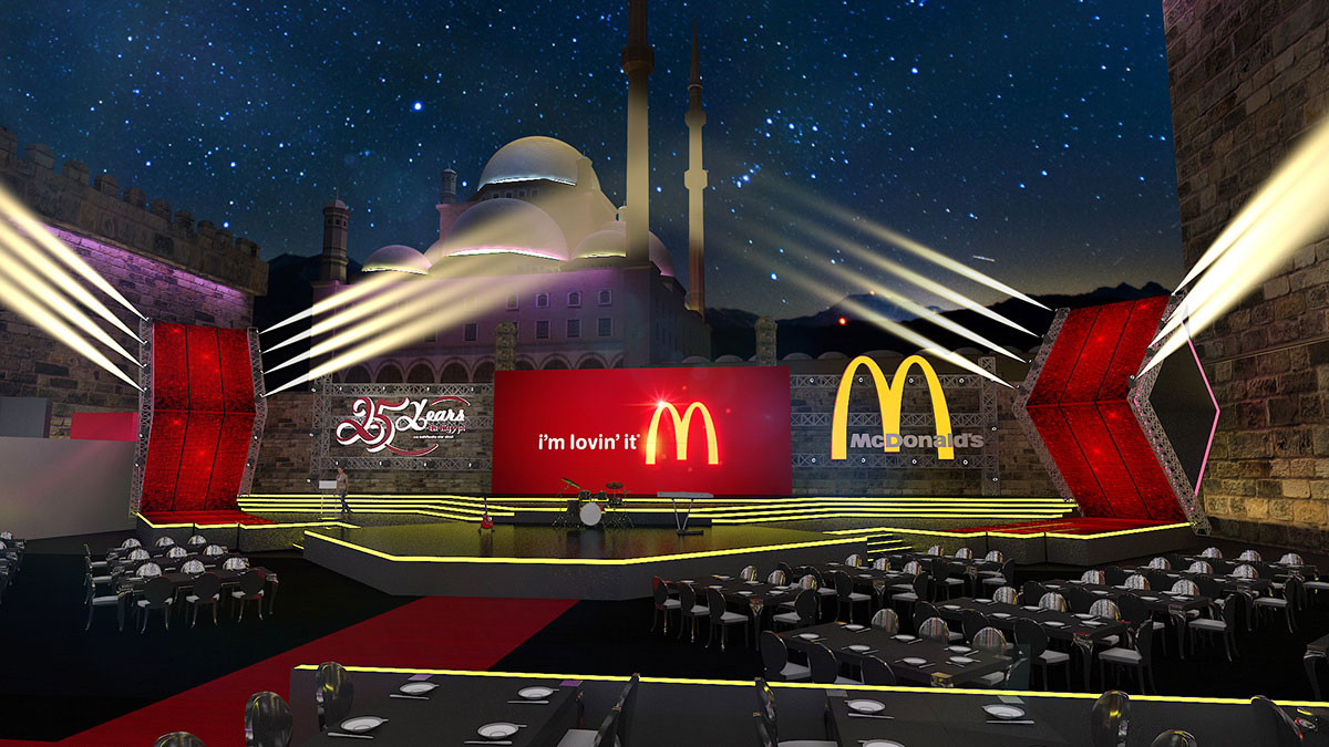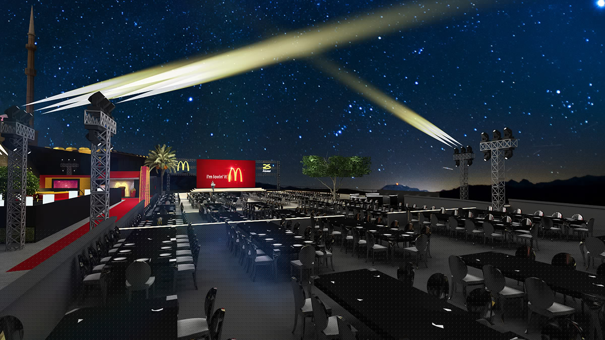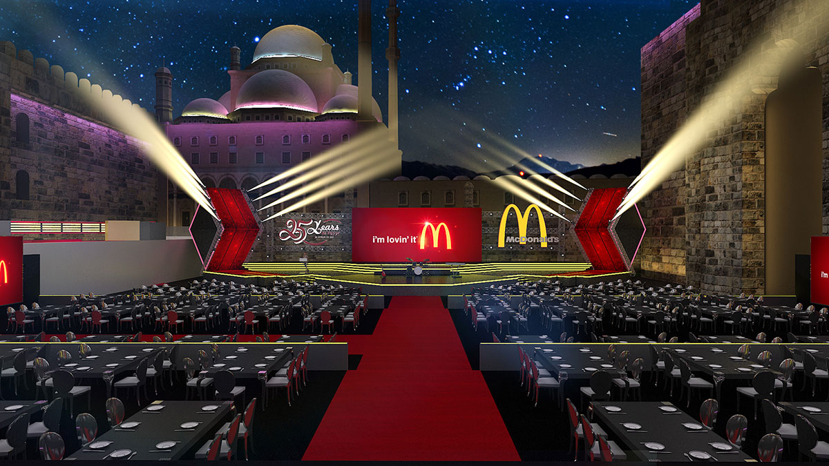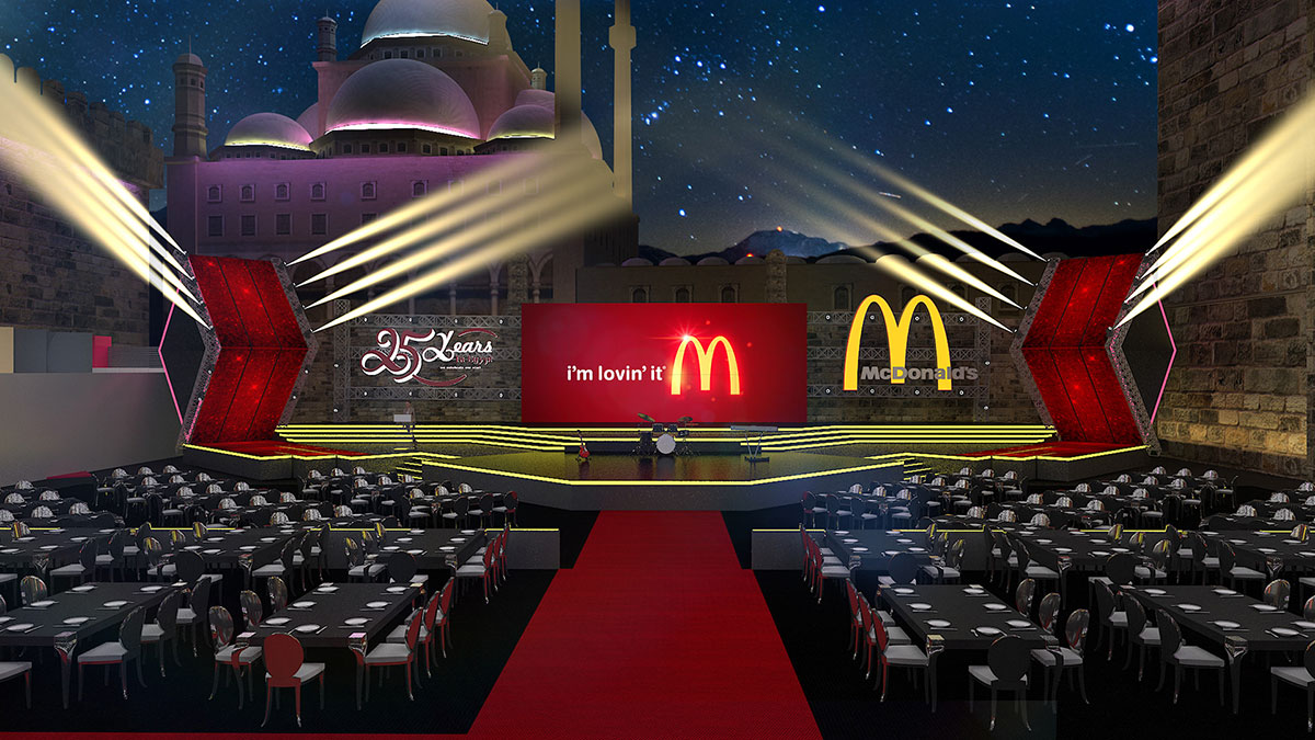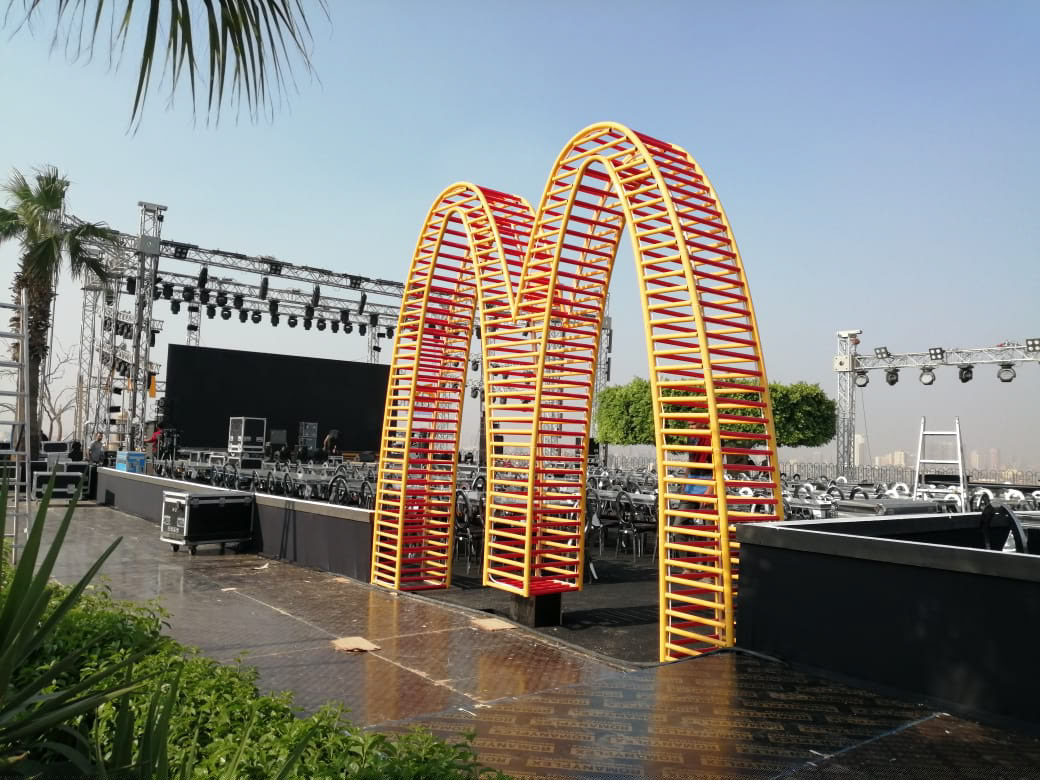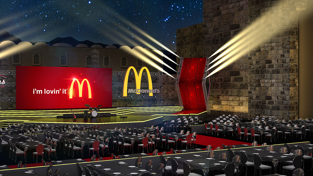 為了體現(xiàn)麥當(dāng)勞M的品牌格調(diào),整場(chǎng)慶典演出的設(shè)計(jì)用的都是傳統(tǒng)的紅色和黃色,符合品牌風(fēng)格和大眾視覺(jué)。舞臺(tái)區(qū)域以充滿埃及風(fēng)格的建筑為背景,舞臺(tái)中央大屏和突顯慶典主題,兩側(cè)分別有兩個(gè)魔方LED屏為輔,同時(shí)還把舞臺(tái)做了T臺(tái)的延伸,與觀眾近距離接觸,而且適合整場(chǎng)晚宴的所有環(huán)節(jié)的節(jié)目表演。在慶典演出現(xiàn)場(chǎng)的門頭以及過(guò)道的設(shè)計(jì)上,則用桁架搭起LOGO和主題,鋪設(shè)紅毯,體現(xiàn)了身份的象征。