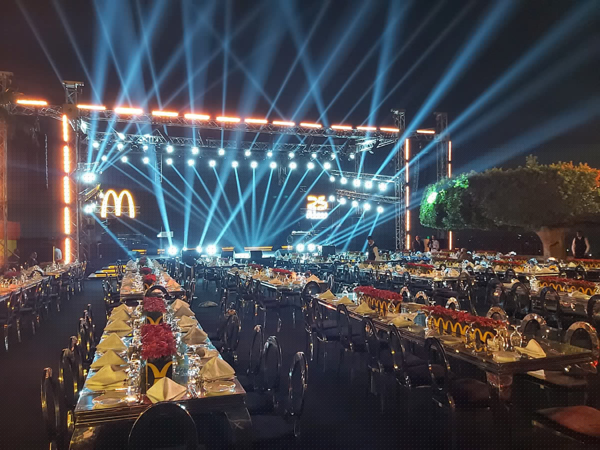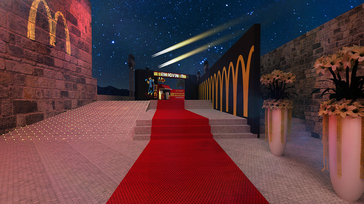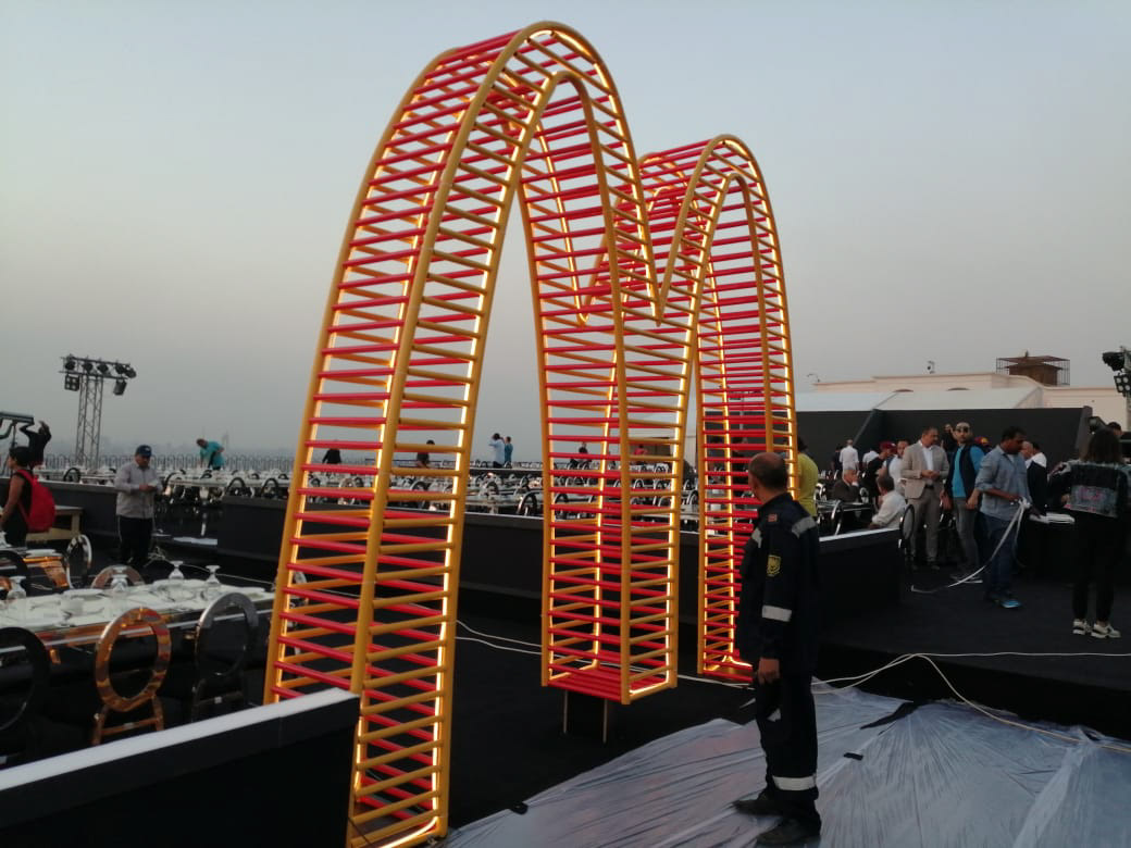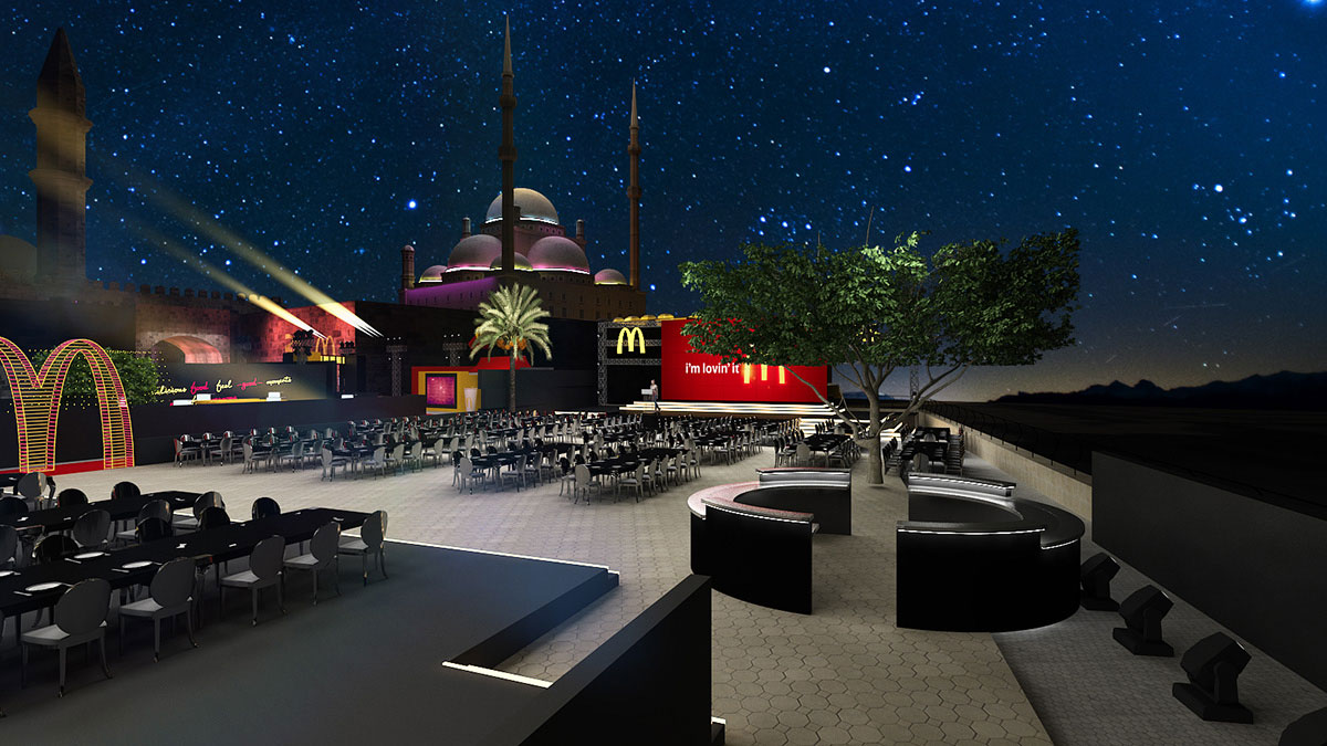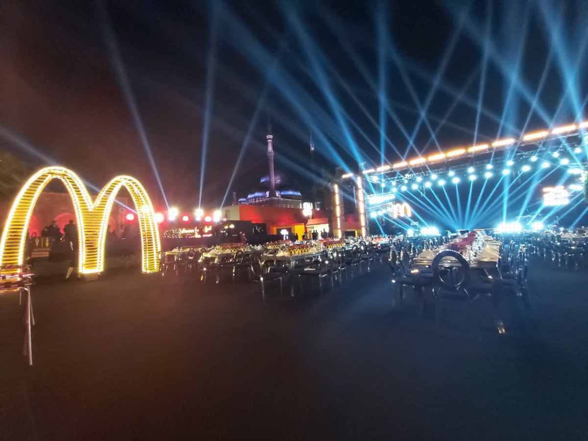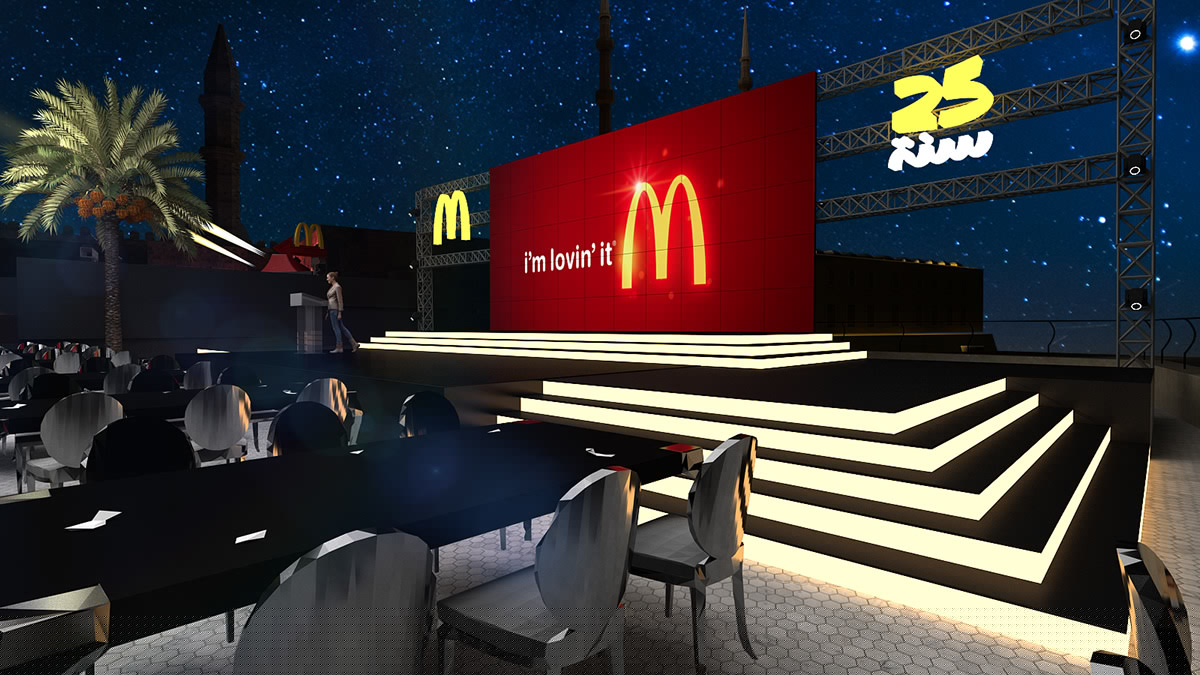 為了體現(xiàn)麥當(dāng)勞M的品牌格調(diào),整場(chǎng)慶典演出的設(shè)計(jì)用的都是傳統(tǒng)的紅色和黃色,符合品牌風(fēng)格和大眾視覺(jué)。舞臺(tái)區(qū)域以充滿埃及風(fēng)格的建筑為背景,舞臺(tái)中央大屏和突顯慶典主題,兩側(cè)分別有兩個(gè)魔方LED屏為輔,同時(shí)還把舞臺(tái)做了T臺(tái)的延伸,與觀眾近距離接觸,而且適合整場(chǎng)晚宴的所有環(huán)節(jié)的節(jié)目表演。在慶典演出現(xiàn)場(chǎng)的門頭以及過(guò)道的設(shè)計(jì)上,則用桁架搭起LOGO和主題,鋪設(shè)紅毯,體現(xiàn)了身份的象征。