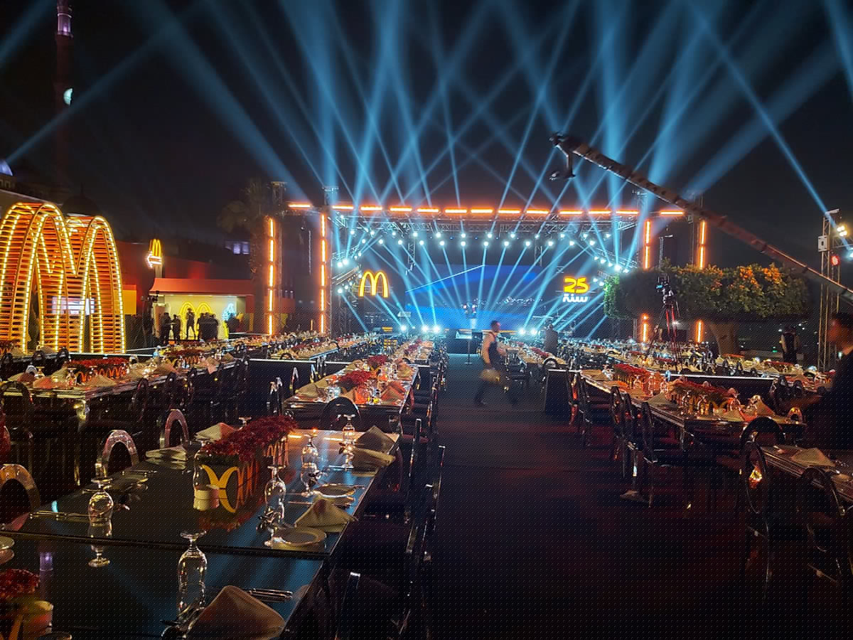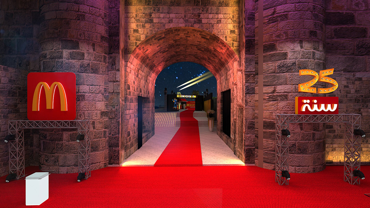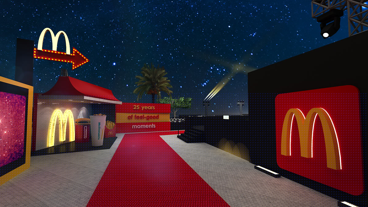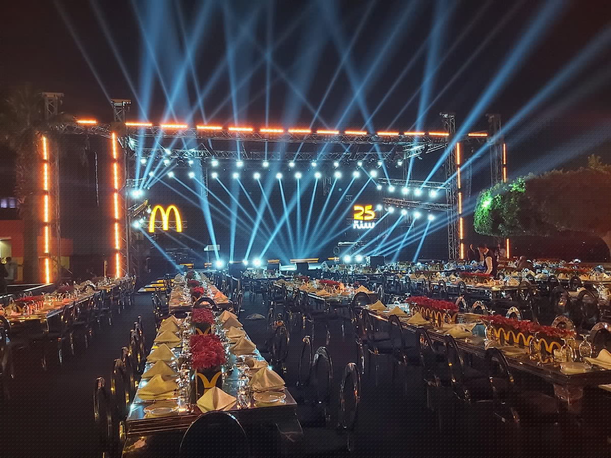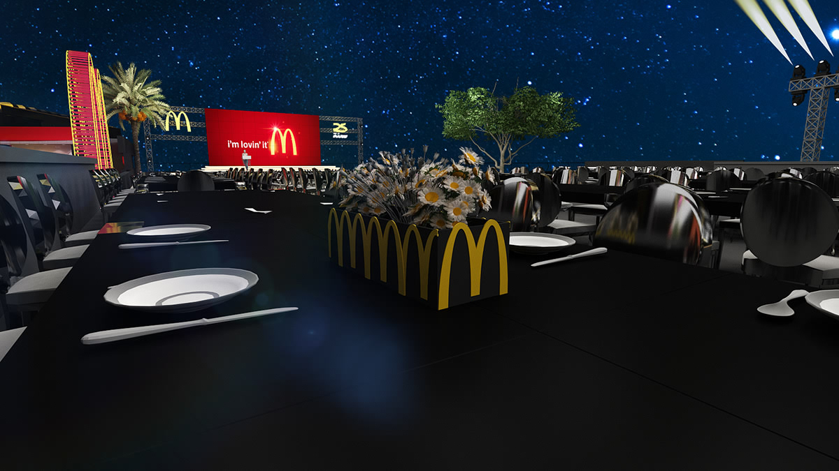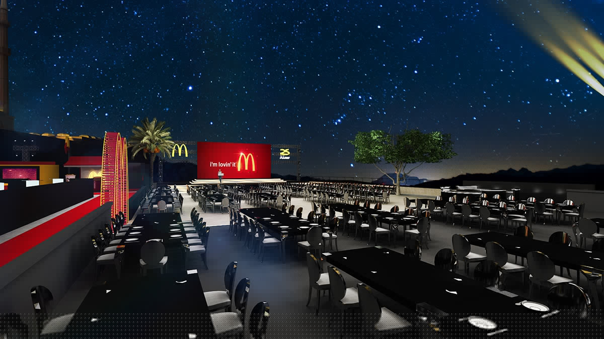 為了體現(xiàn)麥當(dāng)勞M的品牌格調(diào),整場(chǎng)慶典演出的設(shè)計(jì)用的都是傳統(tǒng)的紅色和黃色,符合品牌風(fēng)格和大眾視覺(jué)。舞臺(tái)區(qū)域以充滿埃及風(fēng)格的建筑為背景,舞臺(tái)中央大屏和突顯慶典主題,兩側(cè)分別有兩個(gè)魔方LED屏為輔,同時(shí)還把舞臺(tái)做了T臺(tái)的延伸,與觀眾近距離接觸,而且適合整場(chǎng)晚宴的所有環(huán)節(jié)的節(jié)目表演。在慶典演出現(xiàn)場(chǎng)的門頭以及過(guò)道的設(shè)計(jì)上,則用桁架搭起LOGO和主題,鋪設(shè)紅毯,體現(xiàn)了身份的象征。