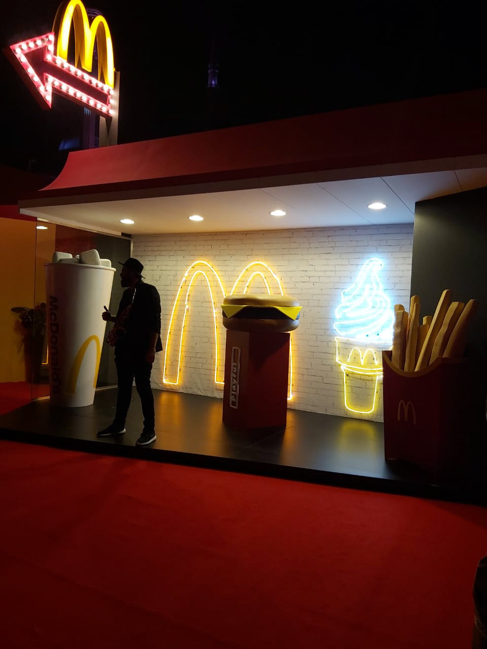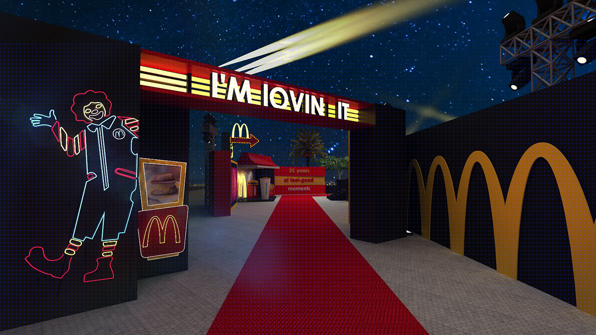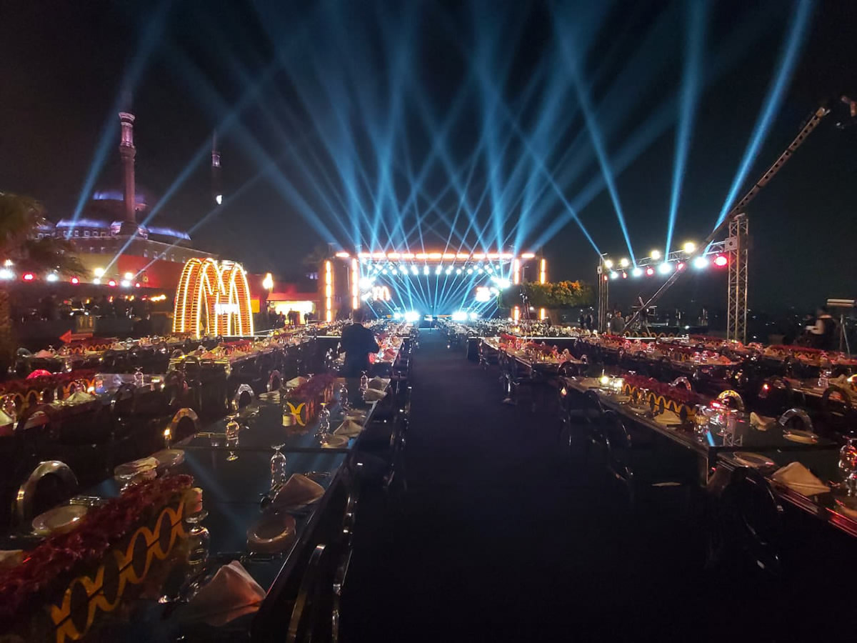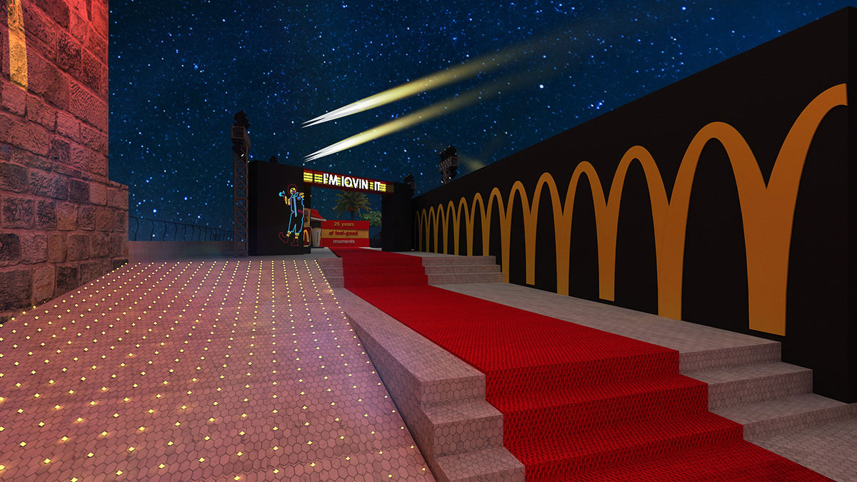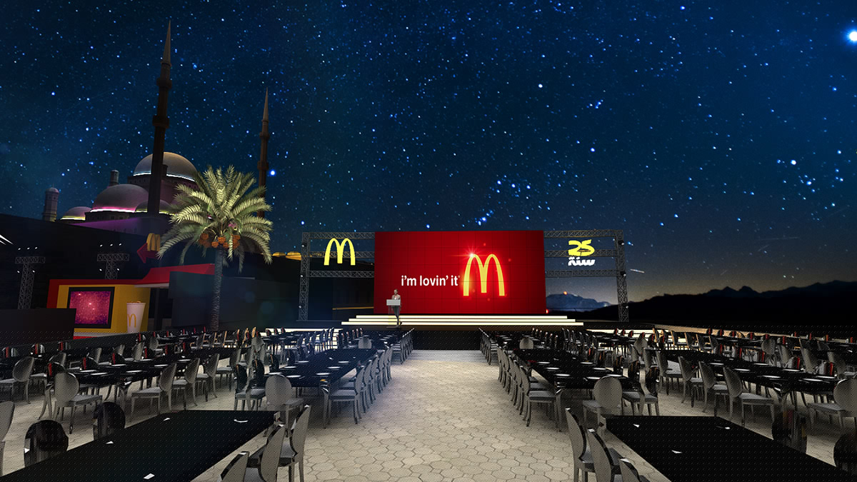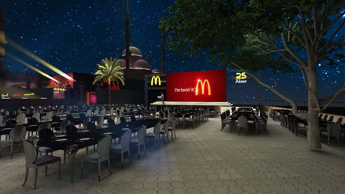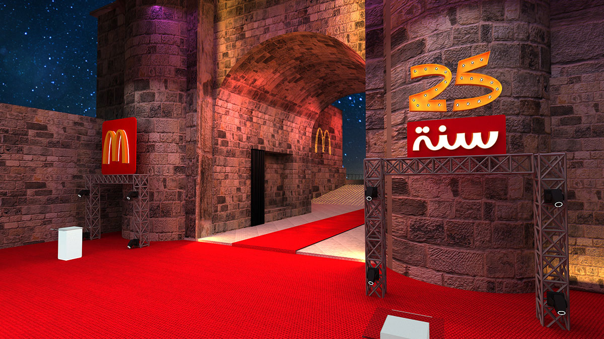 為了體現(xiàn)麥當(dāng)勞M的品牌格調(diào),整場(chǎng)慶典演出的設(shè)計(jì)用的都是傳統(tǒng)的紅色和黃色,符合品牌風(fēng)格和大眾視覺(jué)。舞臺(tái)區(qū)域以充滿埃及風(fēng)格的建筑為背景,舞臺(tái)中央大屏和突顯慶典主題,兩側(cè)分別有兩個(gè)魔方LED屏為輔,同時(shí)還把舞臺(tái)做了T臺(tái)的延伸,與觀眾近距離接觸,而且適合整場(chǎng)晚宴的所有環(huán)節(jié)的節(jié)目表演。在慶典演出現(xiàn)場(chǎng)的門頭以及過(guò)道的設(shè)計(jì)上,則用桁架搭起LOGO和主題,鋪設(shè)紅毯,體現(xiàn)了身份的象征。