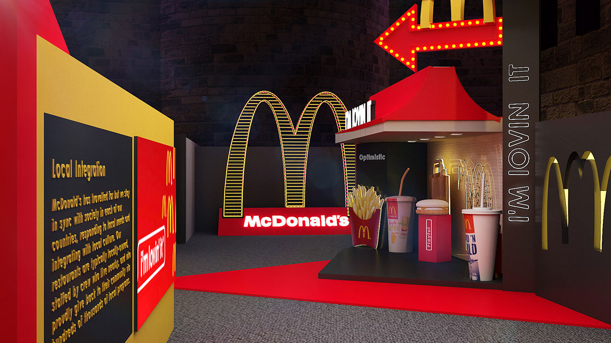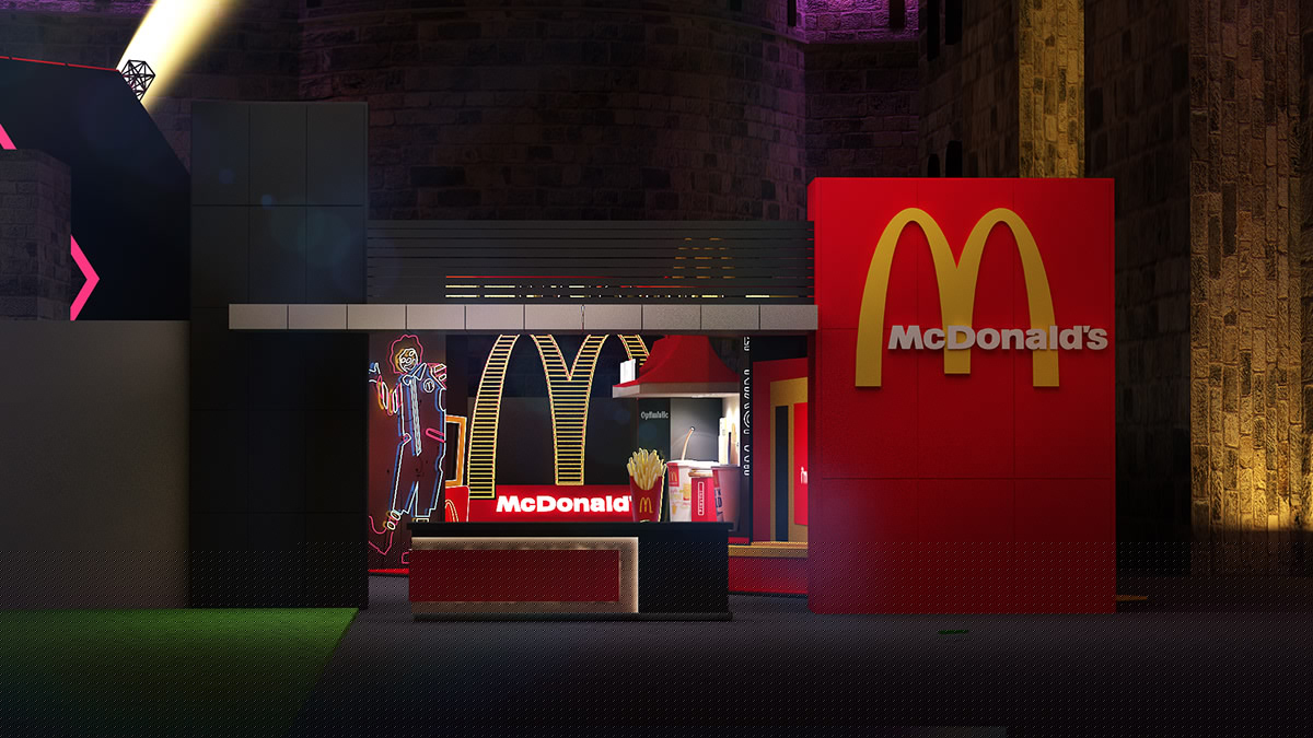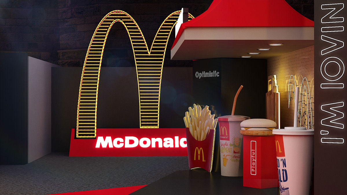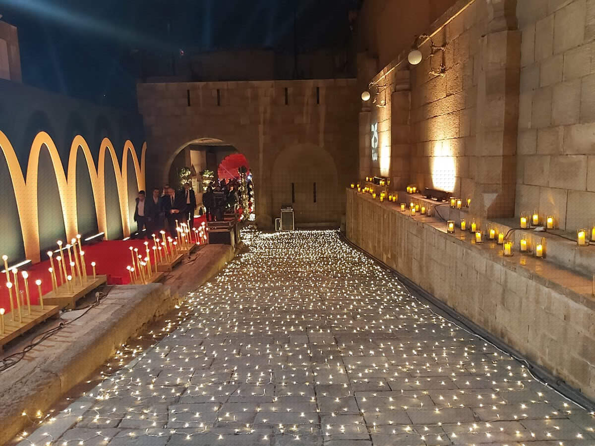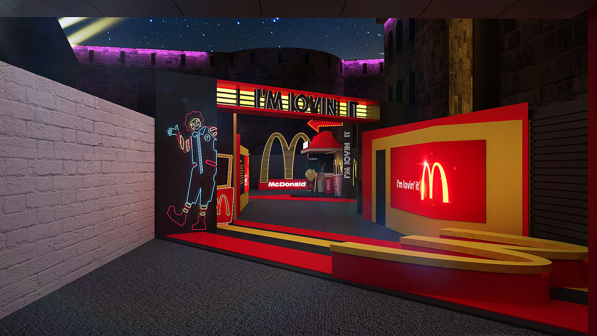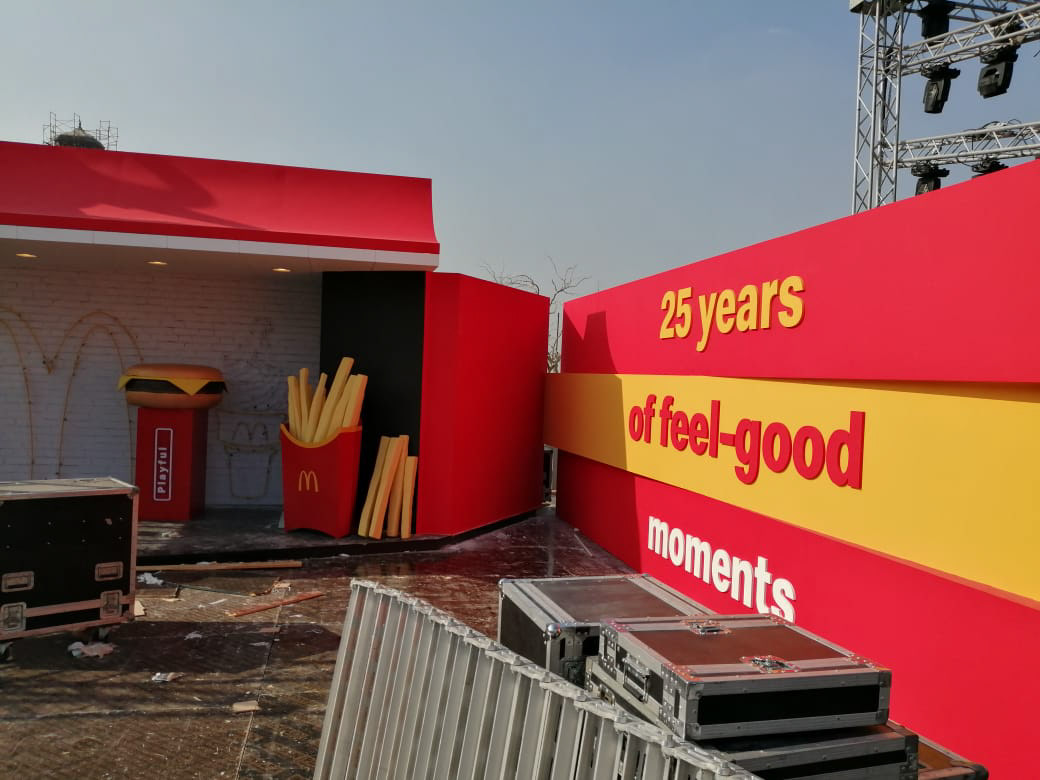 為了體現(xiàn)麥當(dāng)勞M的品牌格調(diào),整場(chǎng)慶典演出的設(shè)計(jì)用的都是傳統(tǒng)的紅色和黃色,符合品牌風(fēng)格和大眾視覺(jué)。舞臺(tái)區(qū)域以充滿埃及風(fēng)格的建筑為背景,舞臺(tái)中央大屏和突顯慶典主題,兩側(cè)分別有兩個(gè)魔方LED屏為輔,同時(shí)還把舞臺(tái)做了T臺(tái)的延伸,與觀眾近距離接觸,而且適合整場(chǎng)晚宴的所有環(huán)節(jié)的節(jié)目表演。在慶典演出現(xiàn)場(chǎng)的門頭以及過(guò)道的設(shè)計(jì)上,則用桁架搭起LOGO和主題,鋪設(shè)紅毯,體現(xiàn)了身份的象征。