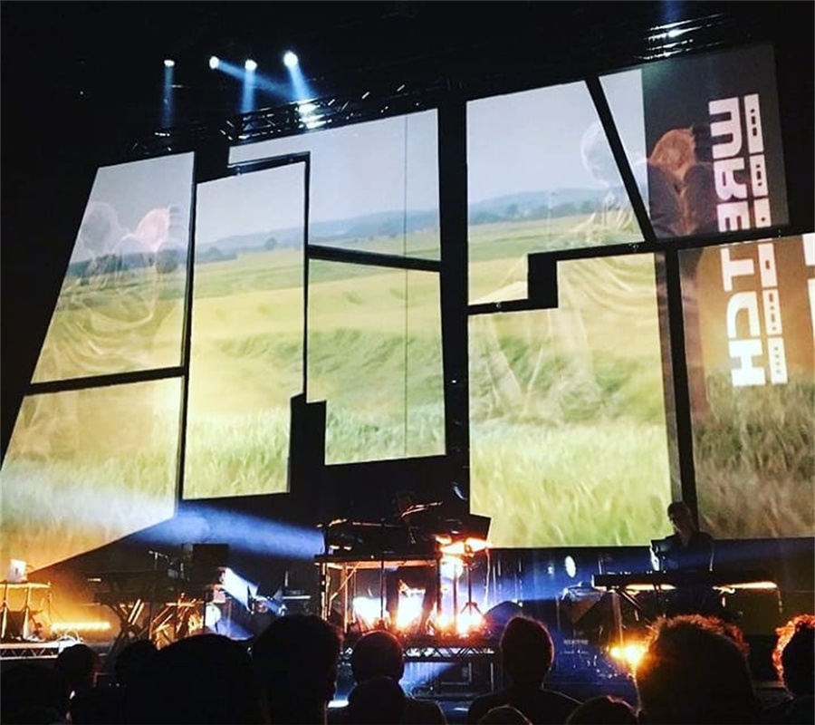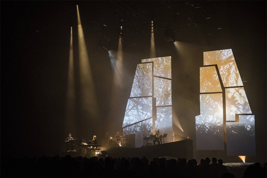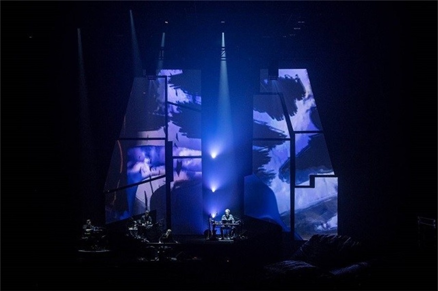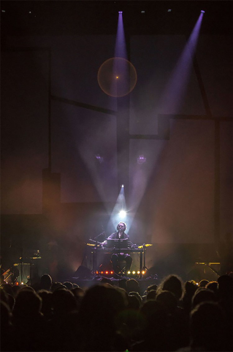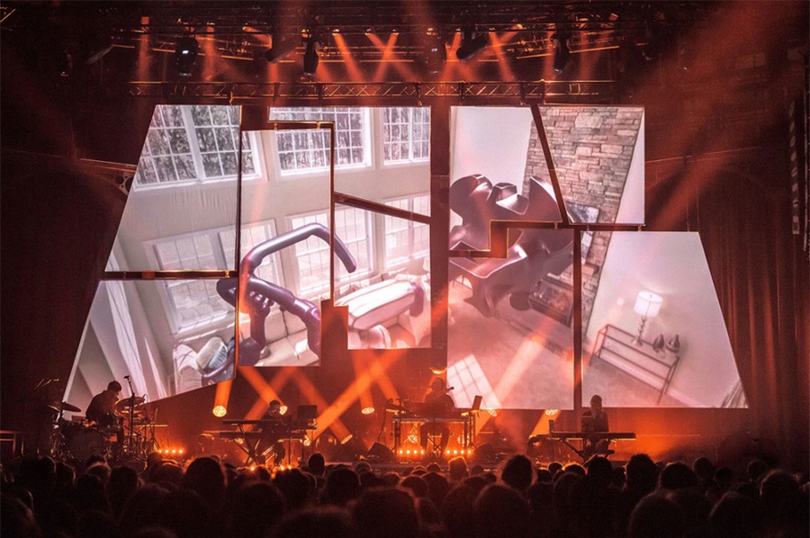丹尼爾·洛帕汀坐在舞臺中央上,舞臺上有一系列古怪的“樂器”包圍著他,而凱利·莫蘭、艾利·凱斯勒和亞倫·大衛(wèi)·羅斯則分別演奏鍵盤、打擊樂器、合成器。