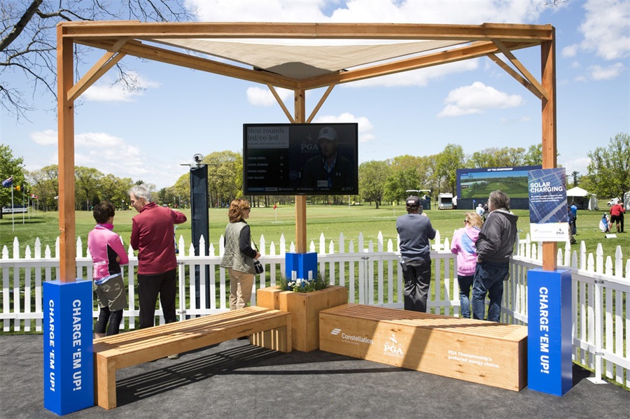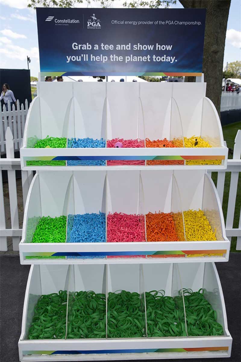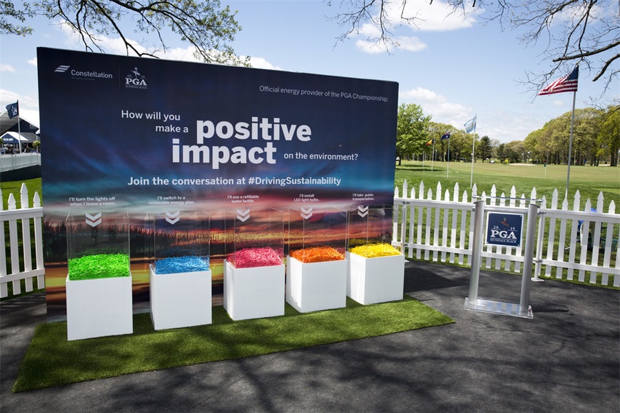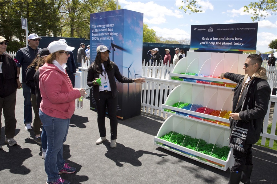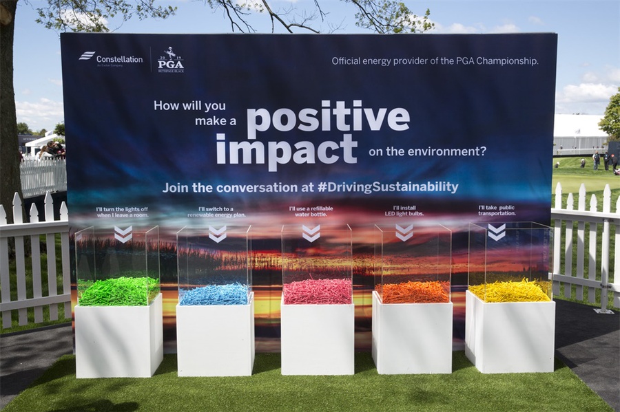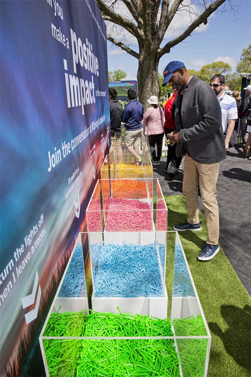 在紐約長島貝斯佩奇·布萊克高爾夫球場舉行的第101屆PGA錦標賽上,美國聯(lián)合能源公司作為本次比賽的官方能源合作伙伴,需要體現(xiàn)該公司注重環(huán)境的理念?;顒又谱髁?萬個彩色高爾夫球座,參加者可以象征性地將這些球座放置在承諾墻前。