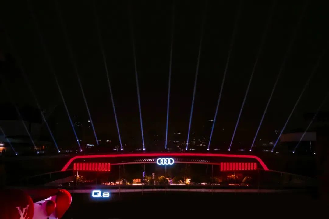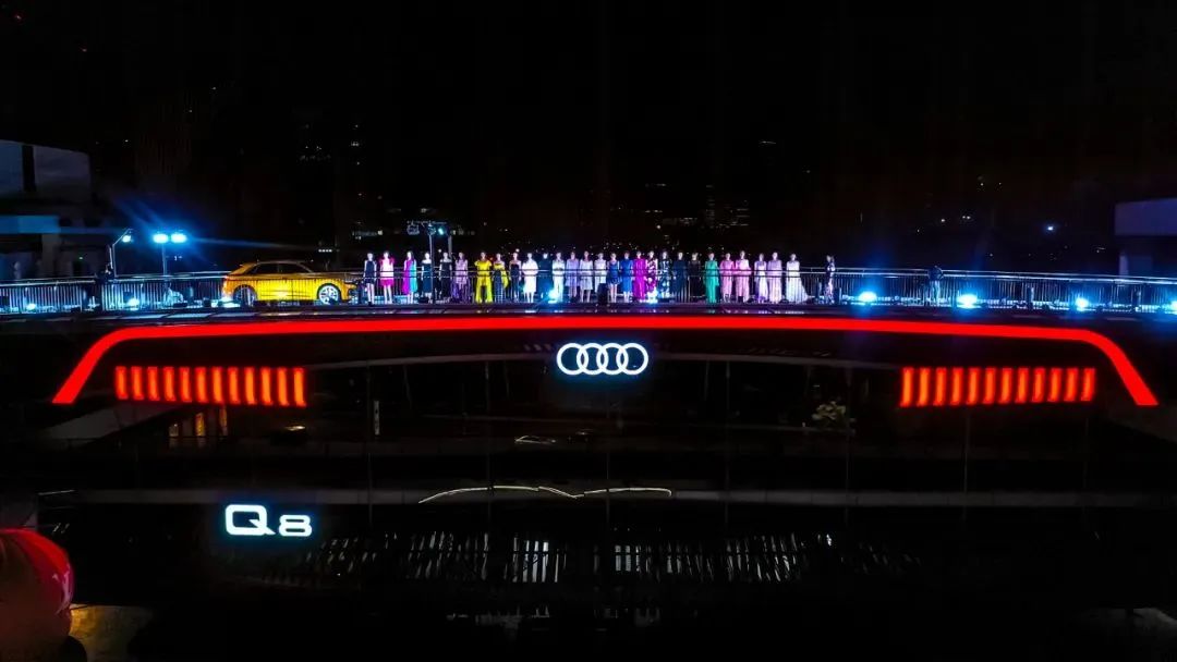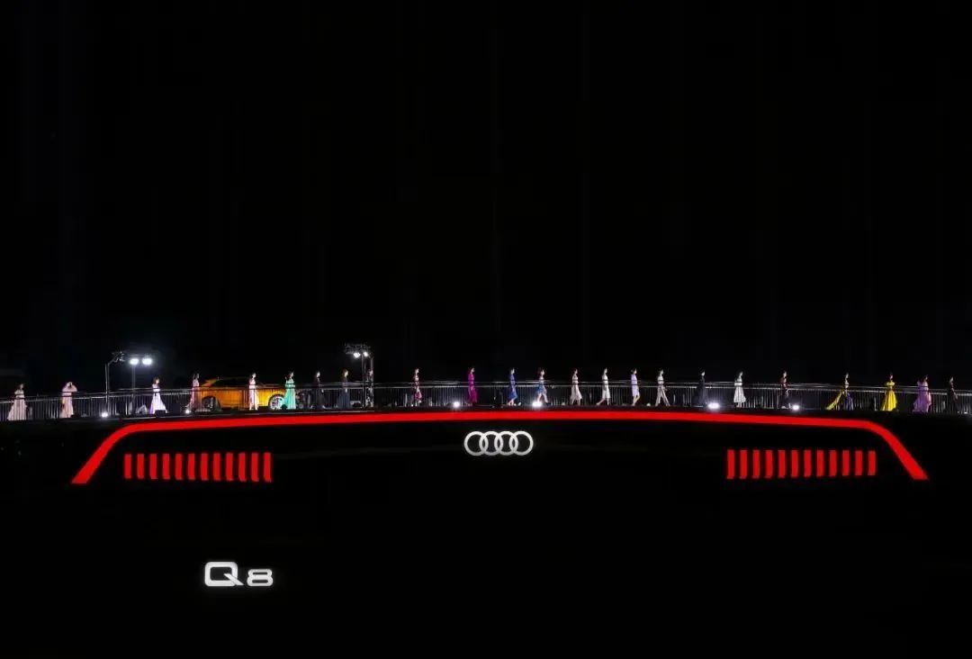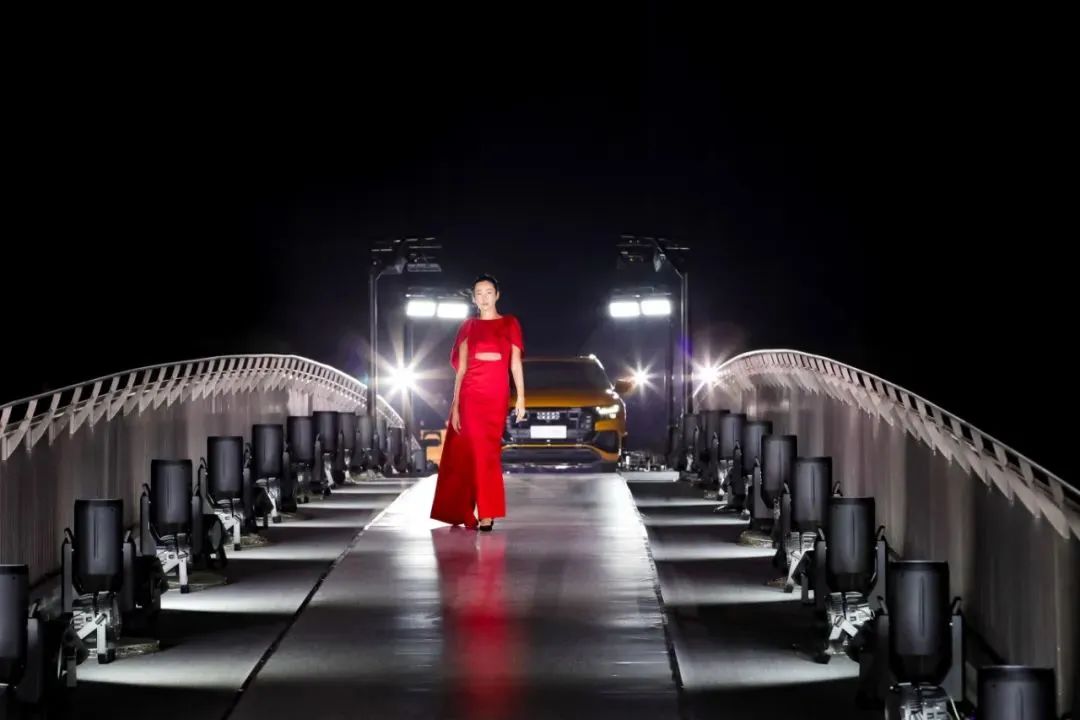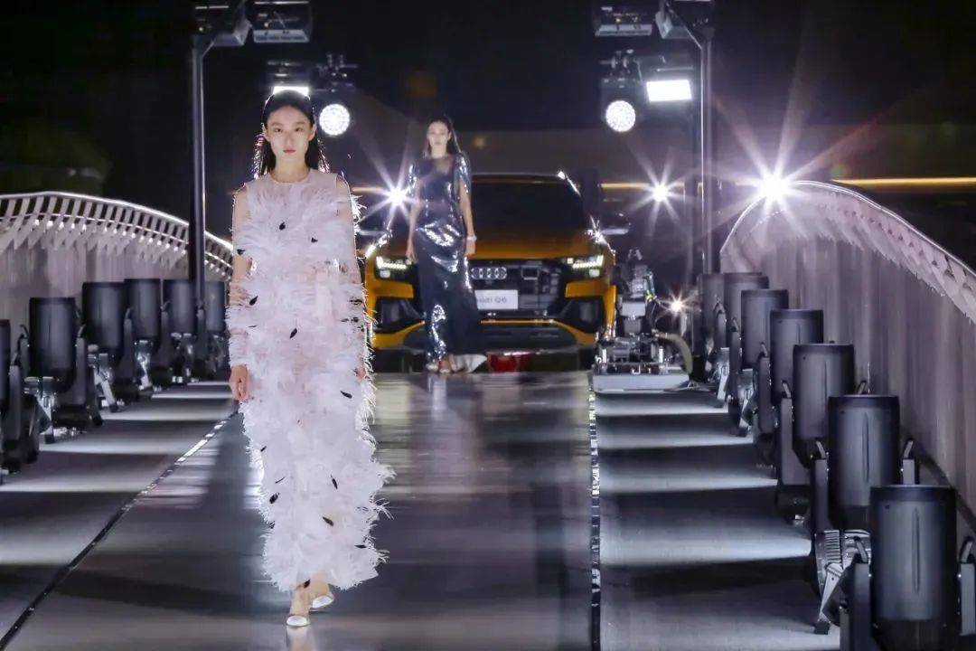 秀場(chǎng)選址在前灘太古里石區(qū)4樓天臺(tái),以兩座相連的空中廊橋?yàn)榛A(chǔ),創(chuàng)新的將奧迪Q8 尾燈造型掛在了廊橋之上,通過(guò)燈光投影的渲染,讓天際線、T臺(tái)、尾燈在同一水平線上,似乎既在空中走秀,又行走在奧迪Q8的車(chē)身之上。簽到區(qū)旁就是格拉蘇蒂手表的展示區(qū)域和奧迪Q8的展車(chē)空間,也成了當(dāng)晚合影拍照打卡的熱門(mén)背景。本次大秀同樣是國(guó)際設(shè)計(jì)師張卉山在國(guó)內(nèi)的首場(chǎng)快閃大秀,雙向奔赴的流量倍增,也成功的讓這場(chǎng)大秀成功刷屏了社交平臺(tái)。