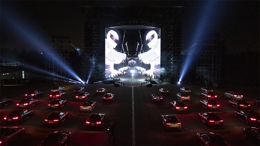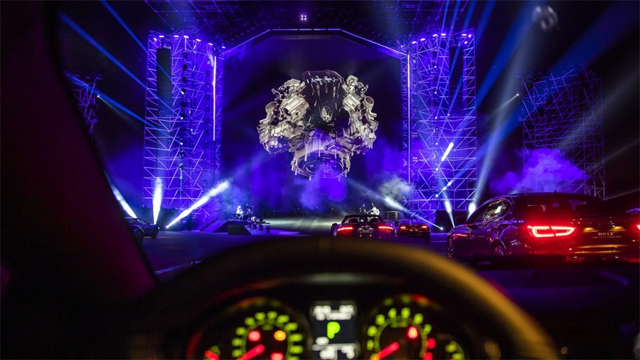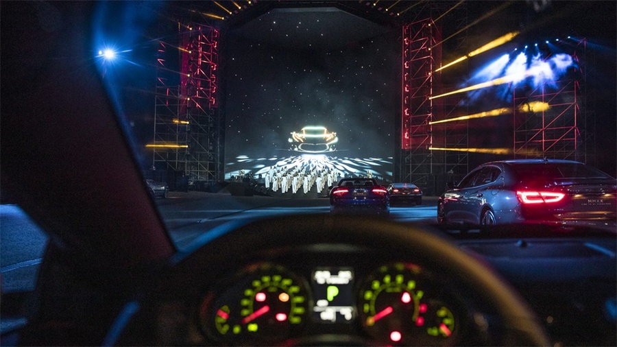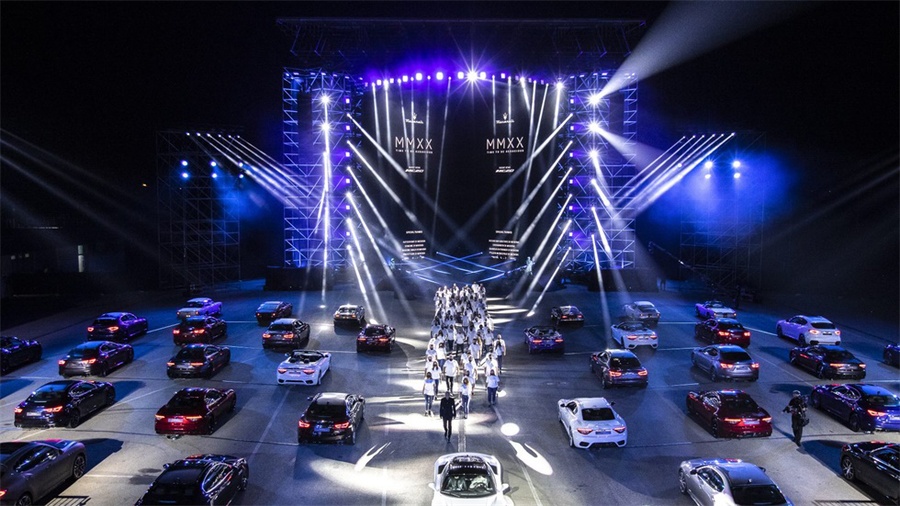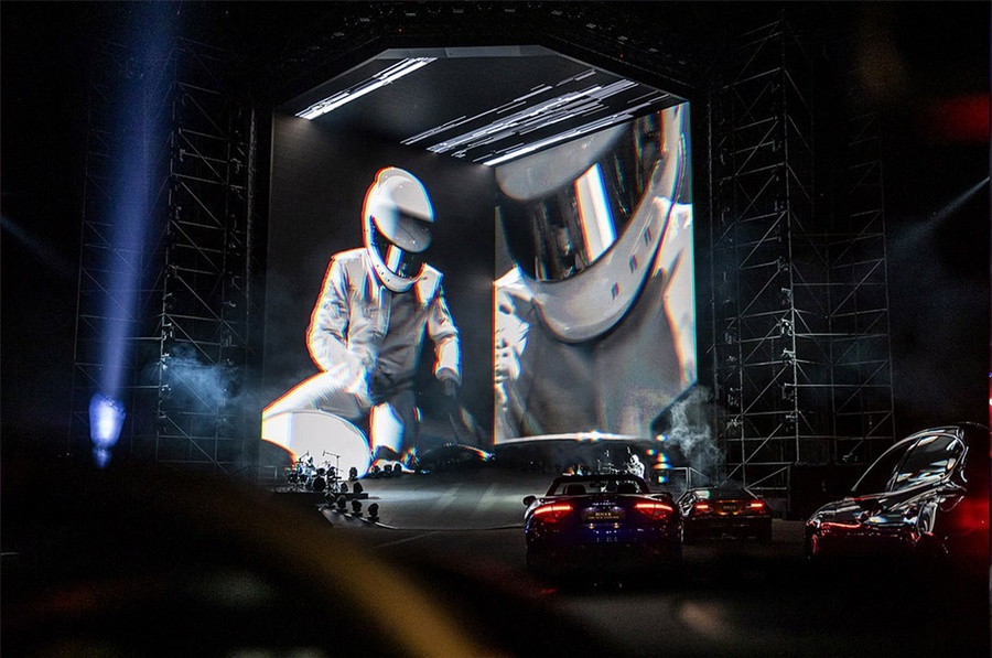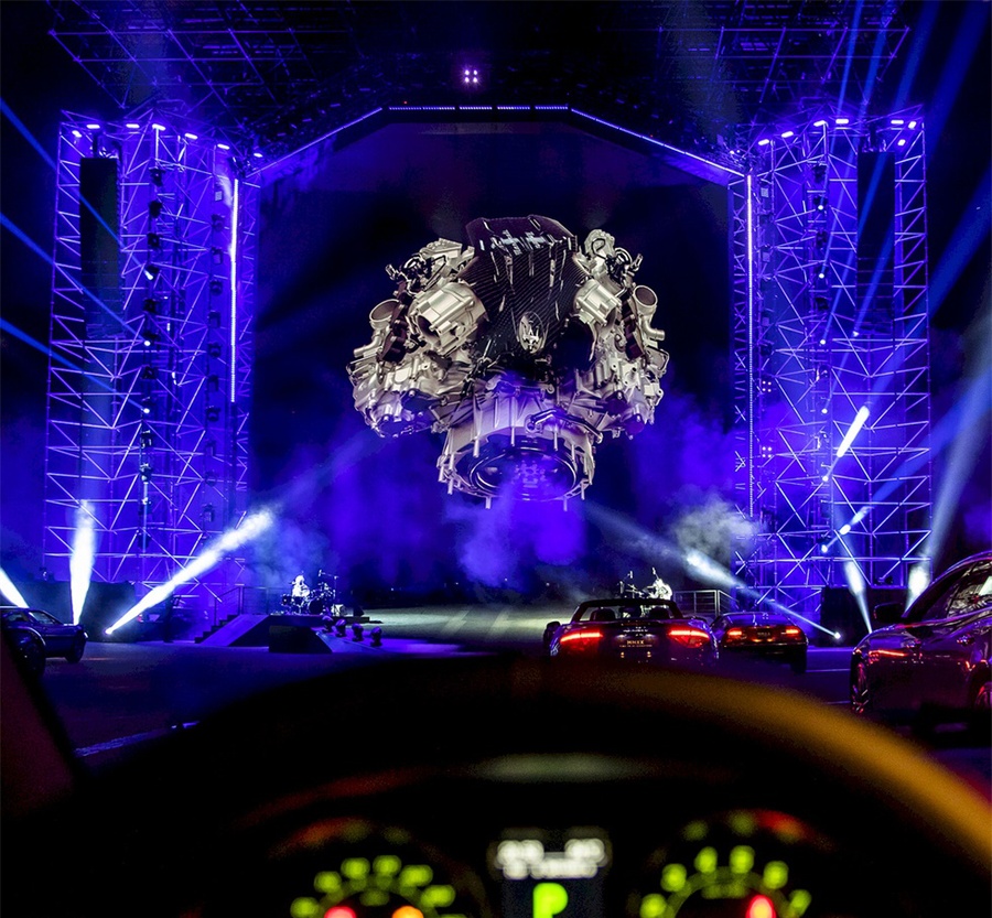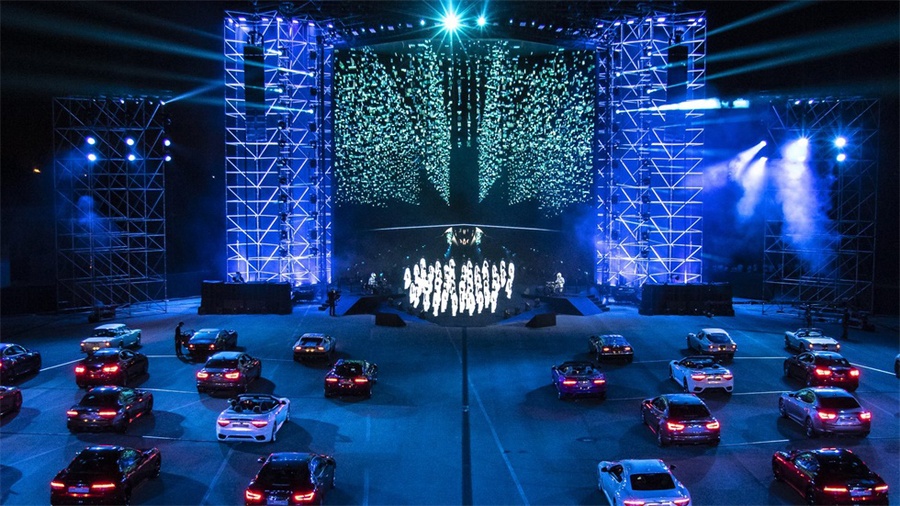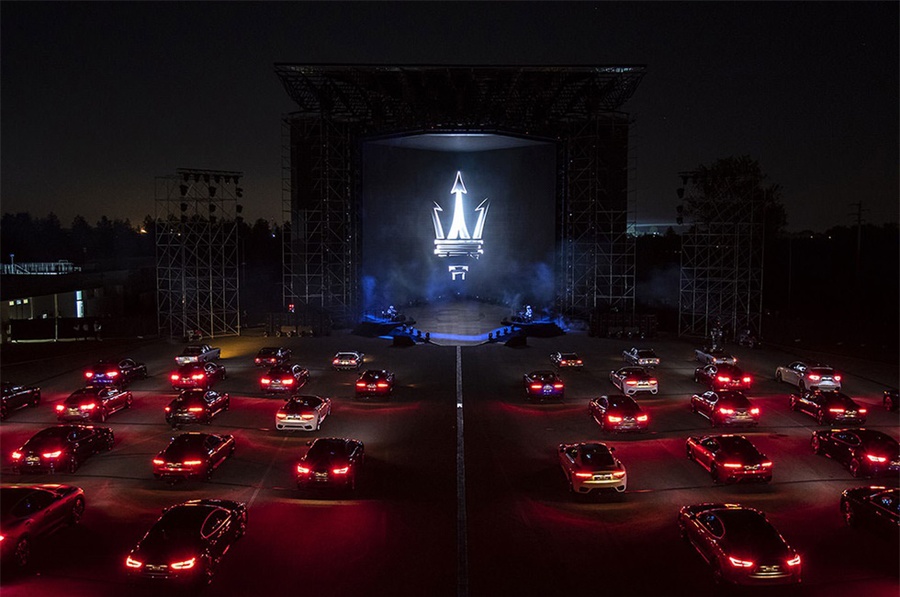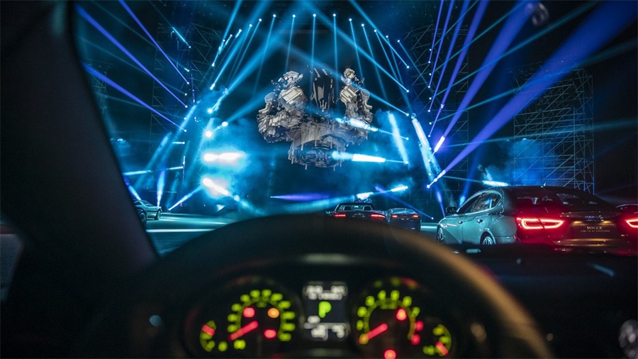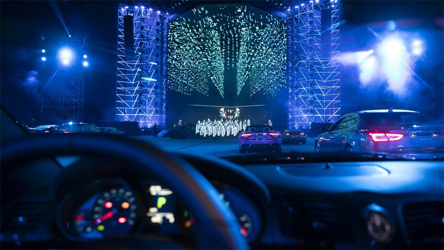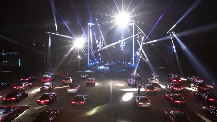 一個(gè)巨大的舞臺(tái),一個(gè)巨大的LED屏幕,來自各個(gè)時(shí)期的44輛瑪莎拉蒂轎車被放置在放射狀的布局中,創(chuàng)造了一個(gè)令人回味的汽車影院環(huán)境,并有限地容納了一小部分觀眾。而它們身后,更多的貴賓和記者們則按照現(xiàn)行的安全距離坐在看臺(tái)上,這種聲音(也是視覺上的)基于對(duì)該品牌獨(dú)特吼聲的詮釋,與一顆新的心臟的跳動(dòng)作比較:?NETTUNO引擎的轟鳴聲,點(diǎn)燃了表演,重新喚醒了瑪莎拉蒂的精神。