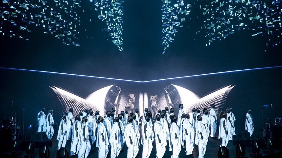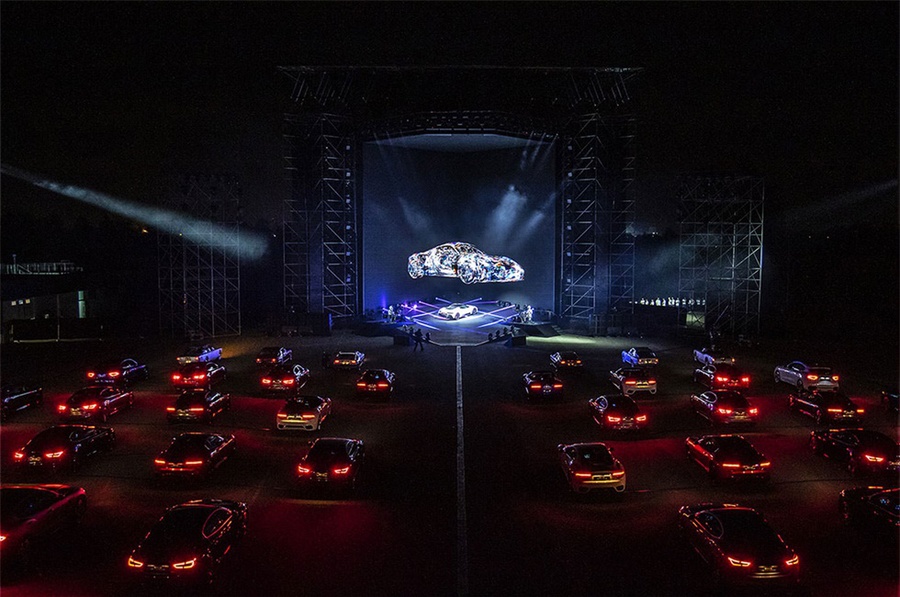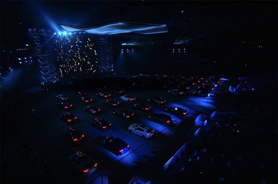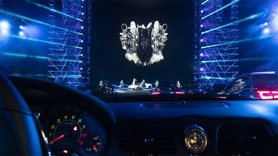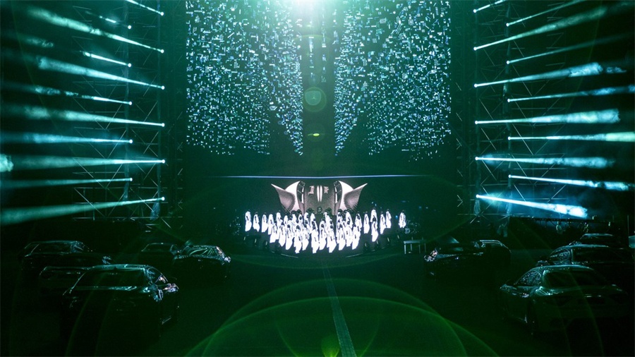 在舞臺(tái)上一系列的變形圖像與服裝、音樂和尖端技術(shù)相融合,增強(qiáng)了真實(shí)和現(xiàn)場(chǎng)表演??旃?jié)奏、激烈、電影化,創(chuàng)造一個(gè)連續(xù)的特別時(shí)刻來引導(dǎo)在場(chǎng)和現(xiàn)場(chǎng)直播的觀眾通向?yàn)楝斏倨放拼蛟烊?、現(xiàn)代的愿景,為這個(gè)終極時(shí)刻所做的準(zhǔn)備,正是這場(chǎng)世界級(jí)新超級(jí)跑車的首發(fā)式。