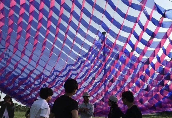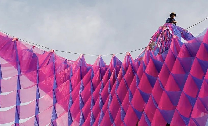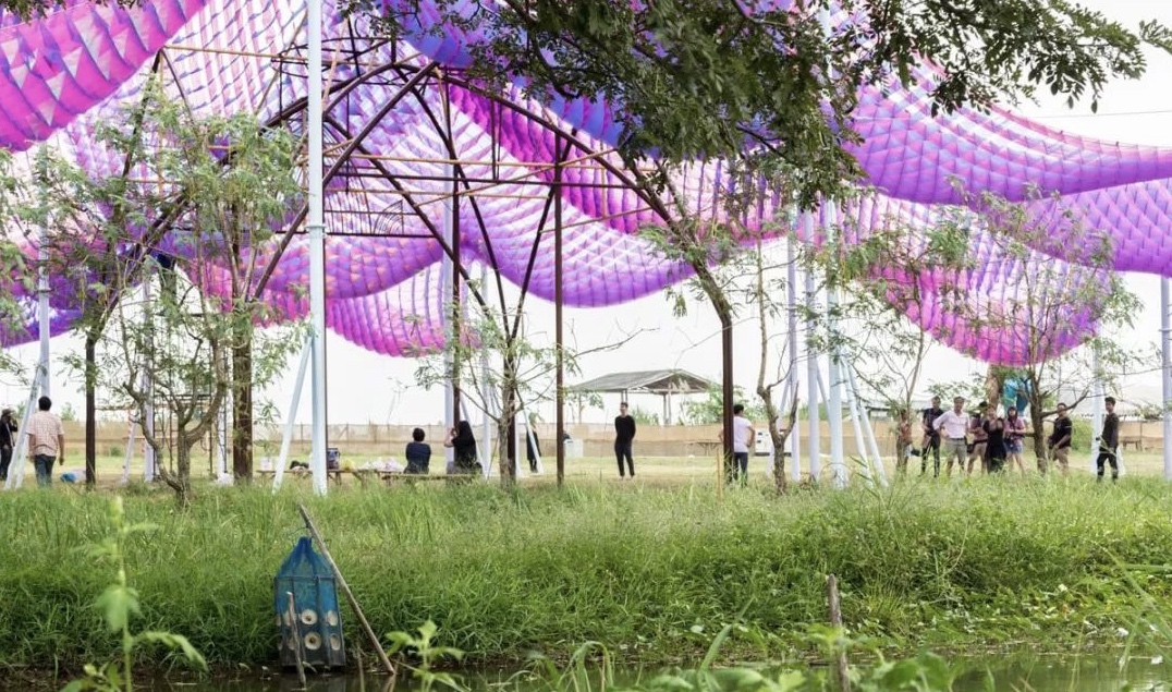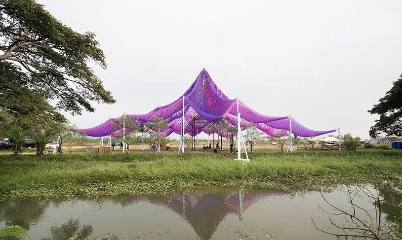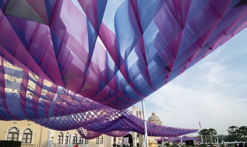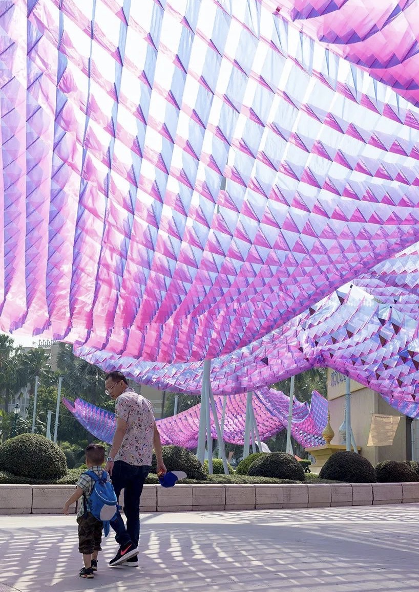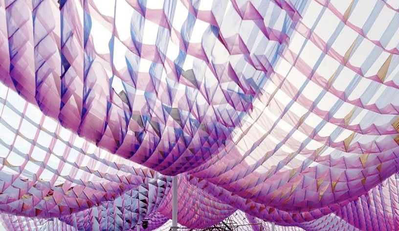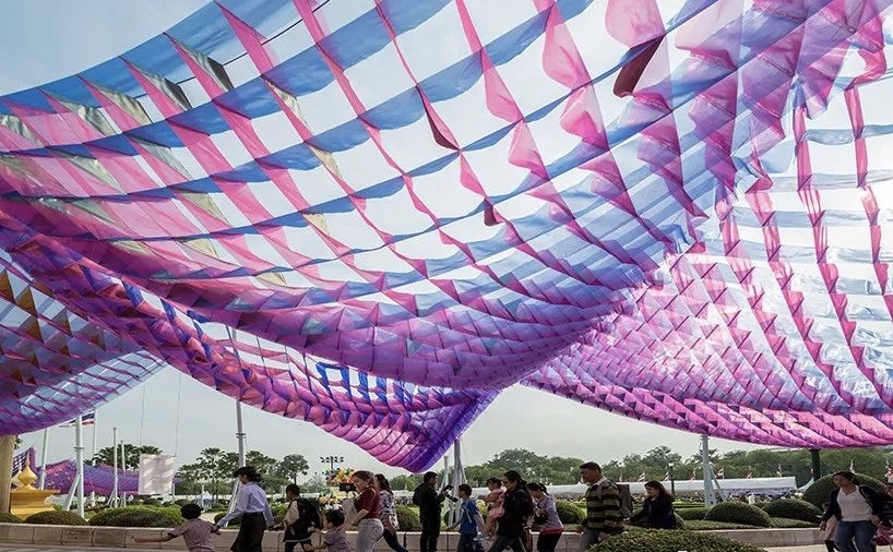 這是一場以可持續(xù)發(fā)展和社會責(zé)任為主題的音樂藝術(shù)活動,“Marmalade Sky(果醬天空)”為泰國芭堤雅的聚會愛好者們遮擋了陽光,同時在地面上創(chuàng)造了藍色和粉色的倒影。這個空中涼棚是由固定在移動混凝土基座上的簡單鋼桿支撐,由幾個8米的正方形織物模塊組成,8米見方的有吉姆·湯普森(Jim Thompson)簽名,垂直和水平條紋交替,同時留下一絲陽光的過濾。