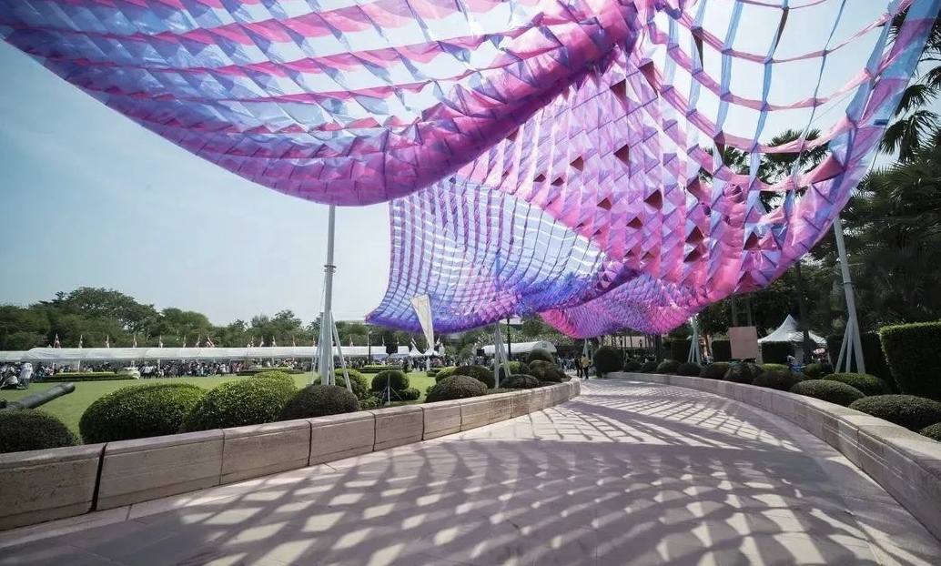 泰國先鋒藝術(shù)音樂節(jié)旨在突出可持續(xù)生活的解決方案,工作室all(zone)創(chuàng)造了一個通風(fēng)多彩的藝術(shù)裝置“Marmalade Sky(果醬天空)”,引導(dǎo)游客進入展覽?!?/span>Marmalade Sky(果醬天空)”帶有多彩的色調(diào),裝置使用的材料是全部回收的,非常環(huán)保,與這次活動的主題相呼應(yīng)。