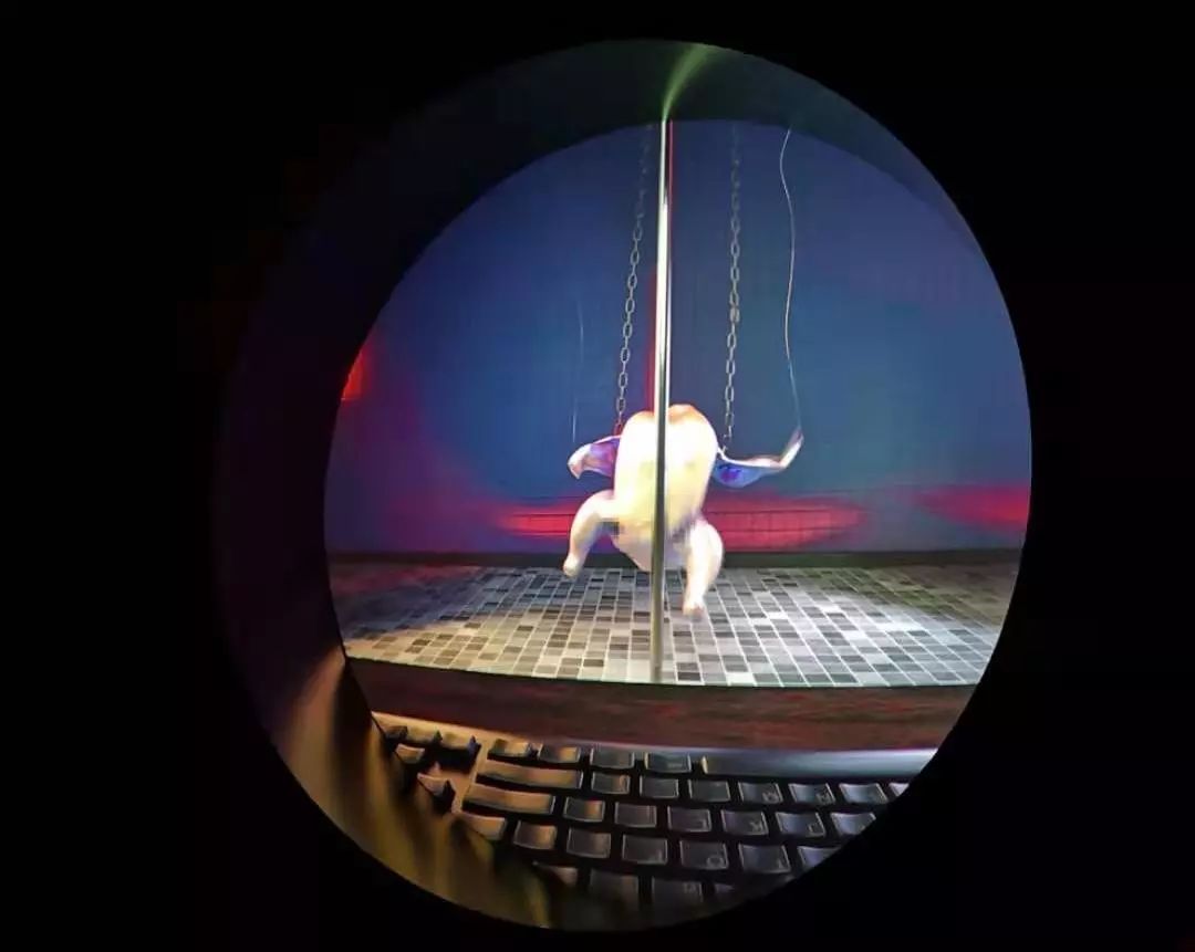 入場就能看見一段影像,主角是一只雞,叫TOM,它每天按時(shí)運(yùn)動(dòng),休息,娛樂,在鏡子前自我欣賞。只不過TOM沒有頭,它的一切完美活動(dòng)都由固定程序支配,一舉一動(dòng)都如牽線木偶。它也可能成為你,你,你,你們。