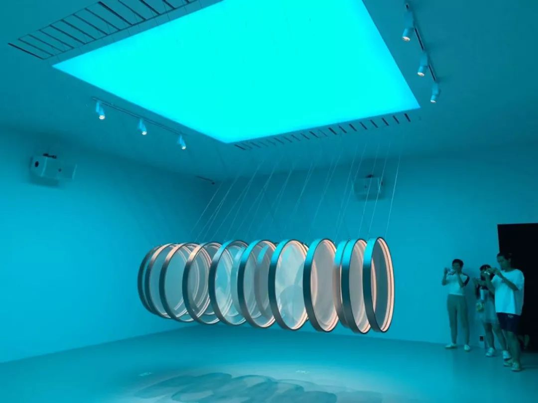 圓形的矩陣機(jī)械根據(jù)程序的設(shè)定,在既定時(shí)間內(nèi),呈現(xiàn)空間和色彩的變幻.雖說大多數(shù)人逛展喜歡拍拍拍,但是現(xiàn)場有更多的人愿意放下手機(jī),去體驗(yàn)這個(gè)裝置所帶來的規(guī)律與生機(jī),感受純粹和靜謐的空間。