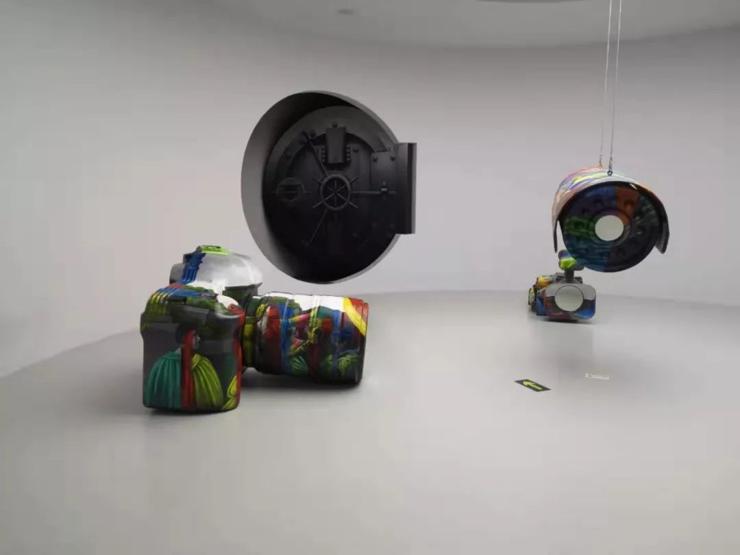 偌大的灰色空間里只擺放了幾個(gè)被放大拍攝裝置,無論你站在哪里都會(huì)被它們“拍到”,暗喻了我們現(xiàn)在的生活被攝像機(jī),照相機(jī),手機(jī)所記錄,限制在不斷放大。隱秘的珍貴感與記錄工具的使用仿佛化作一把雙刃劍,被記錄的同時(shí)被傳播。
