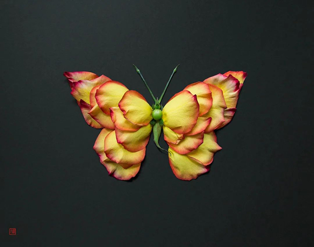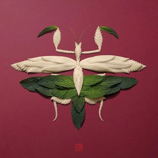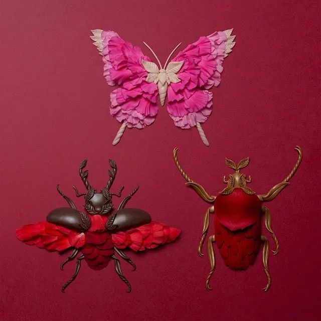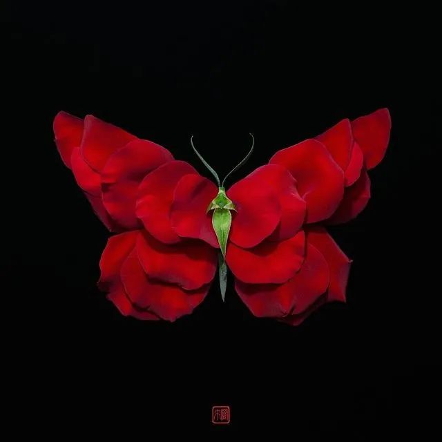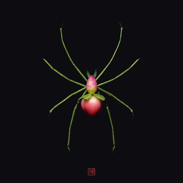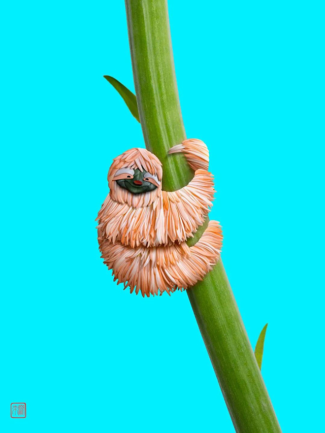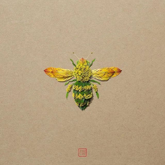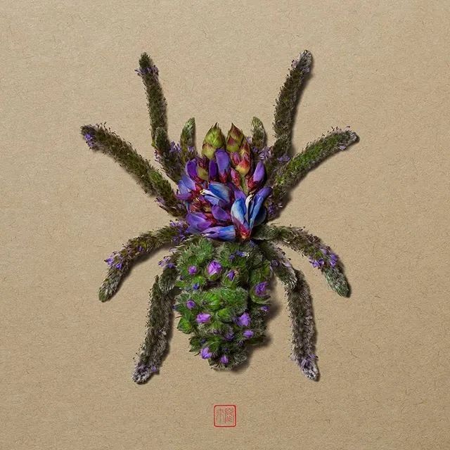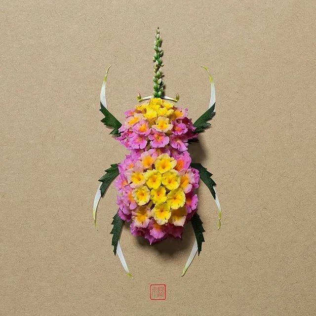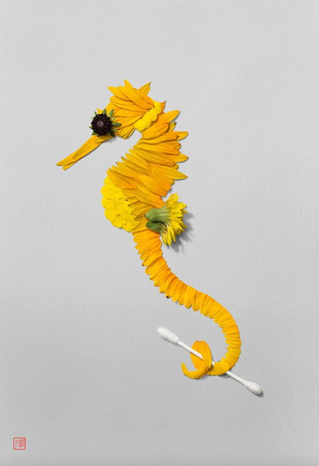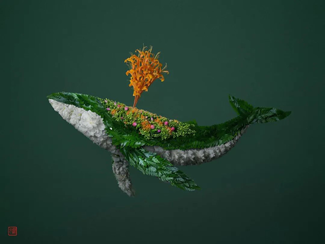 井上羅來(Raku Inoue)以其對甲蟲、昆蟲和蝴蝶的植物學(xué)排列而聞名,他再次將動植物聚集在一起。他之前的作品經(jīng)常把動物擺成固定的姿勢,就像把貓頭鷹或蝎子的肖像別在一個玻璃盒子里,作為收藏品的一部分。不過,他的Natura Wildlife系列的最新作品中顯示了一種活潑和動感,從鯨魚的氣孔噴出橙色花朵到一只海馬抓著棉簽。