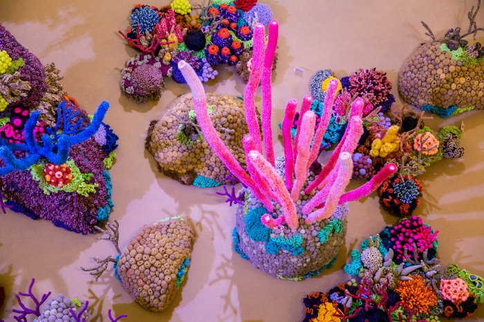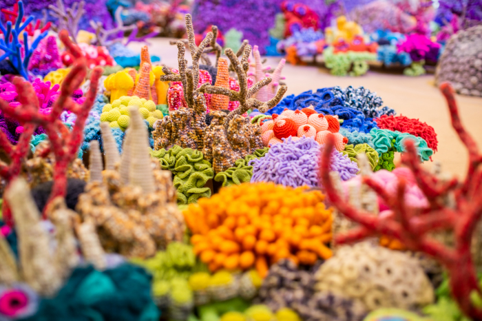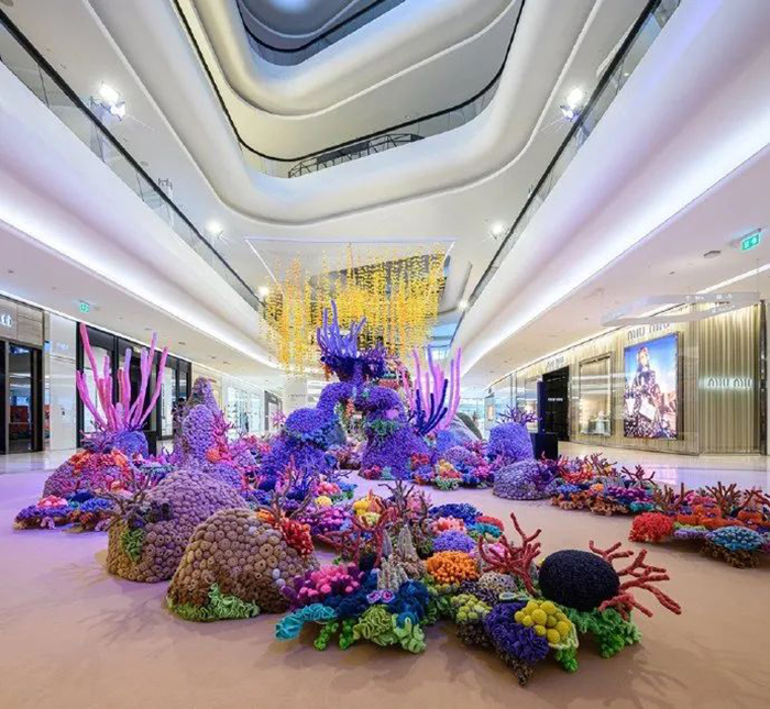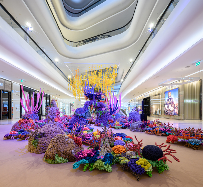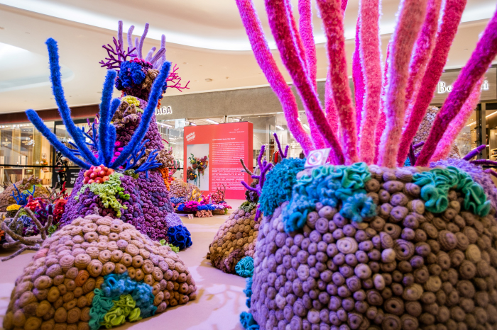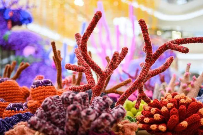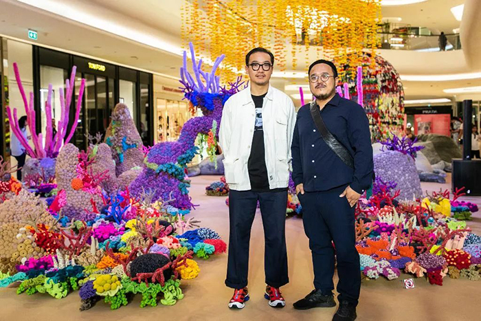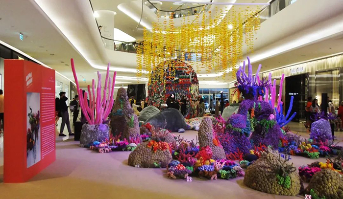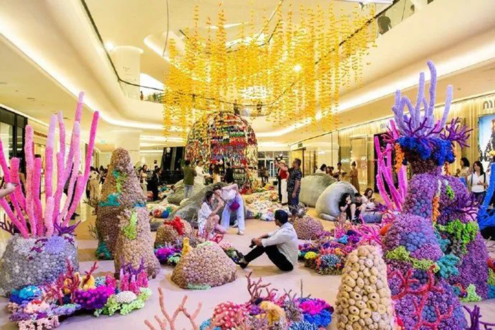另一個(gè)裝置是由廢棄的棉花和鯨魚(yú)骨架裝置制成的四條大型鯨魚(yú),分別高2米和1.5米。鯨魚(yú)是地球上最大的哺乳動(dòng)物,1800年之前,因?yàn)轹L魚(yú)油的龐大需求,鯨魚(yú)被大肆捕殺,現(xiàn)在瀕臨滅絕的威脅。他還帶來(lái)了以前在印度尼西亞展示的杰作,此作品首次在泰國(guó)亮相,其中包括5,000條各種魚(yú)類、珊瑚礁和海洋動(dòng)物,所有這些栩栩如生的作品都是由工廠遺留或廢棄的織物和紗線制成。