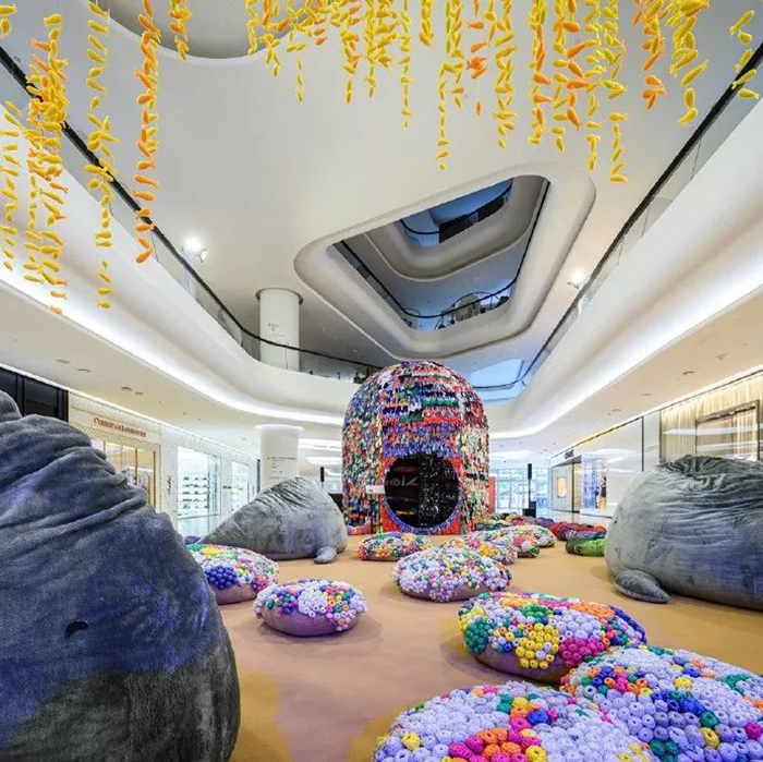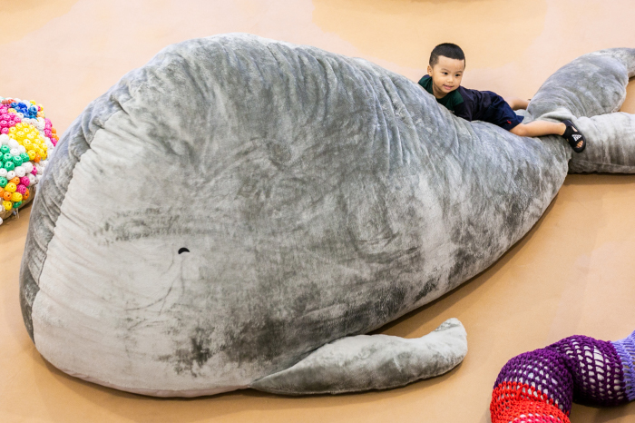 在這次展覽中,Mulyana帶來(lái)了全新創(chuàng)作的所有杰作,例如由廢棄金屬制成的12米長(zhǎng)的巨型鯨魚(yú)骨架,并與植物和樹(shù)木完美融合在一起。還有一個(gè)5米高的Mogus,這是藝術(shù)家心中的另一個(gè)自我。栩栩如生的4條鯨魚(yú)、5000條各種魚(yú)類和1個(gè)大型珊瑚礁都是由工廠遺留或廢棄的織物和紗線制成。