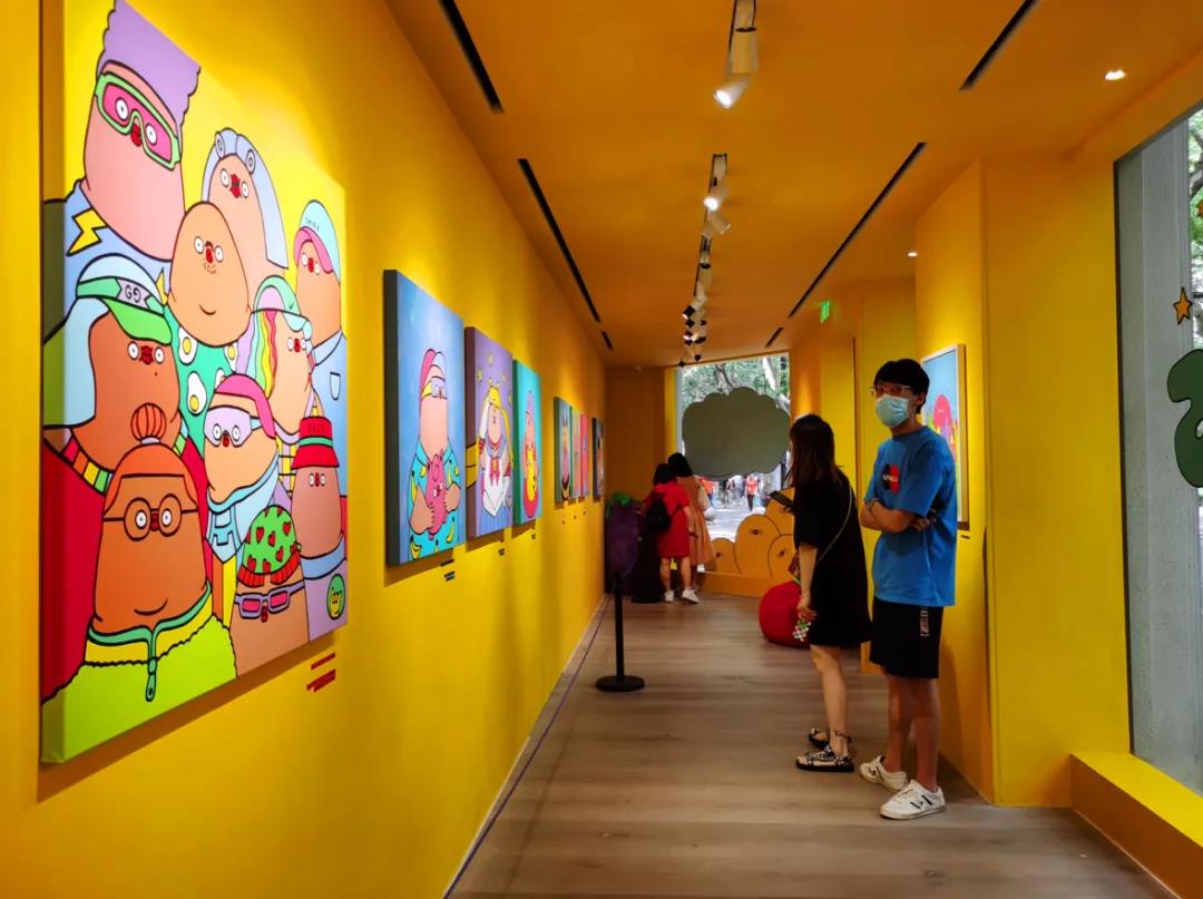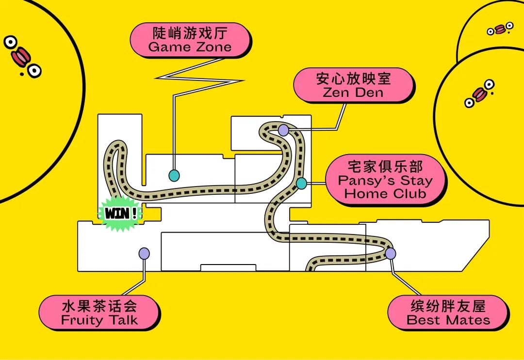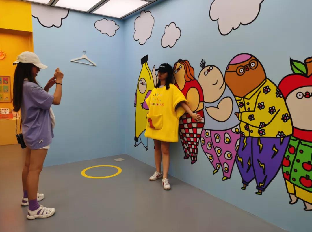 根據展覽特性,展館被分為5個區(qū)域,分別為水果茶話會、繽紛胖友屋、宅家俱樂部、安心放映室、陡峭游戲廳。