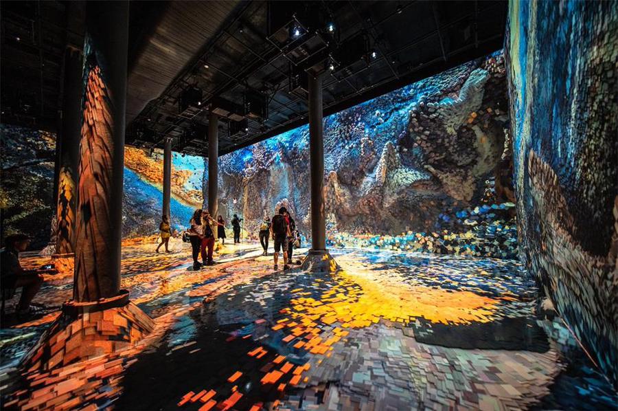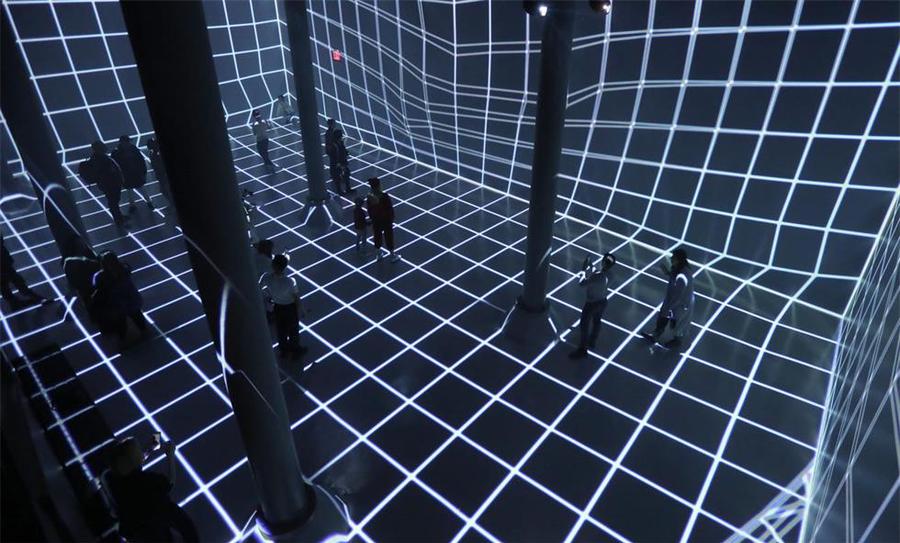展覽中設(shè)計了互動元素,包括跟隨訪客動作的屏幕,然后從夾層區(qū)走到到樓下時,投影機會以不同的“經(jīng)典藍色”字樣照亮墻壁和地板。它是通過視覺,聲音和品味,通過帶有伴隨的節(jié)拍或器樂作品的投影來探索色彩,以伴隨視覺運動,在某一時刻,甚至還具有地球的巨大圖像,并演變成一個閃閃發(fā)光的球體。借助智能手機應(yīng)用程序,客人可以進一步沉浸于“增添”藍色感覺的增強現(xiàn)實飲料中。