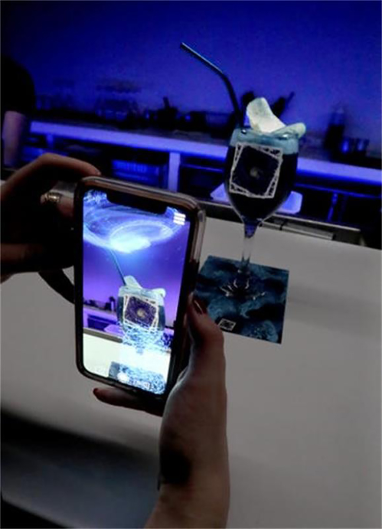 互動現(xiàn)場還是美國第一個增強現(xiàn)實酒吧,這里提供受“經(jīng)典藍色”啟發(fā)的特制飲料,客人通過下載一個軟件,就能在手機里看到通過增強現(xiàn)實技術(shù)進行了視覺效果增強的飲料,同時還能通過軟件激活在空間里的其它隱藏的藝術(shù)品。