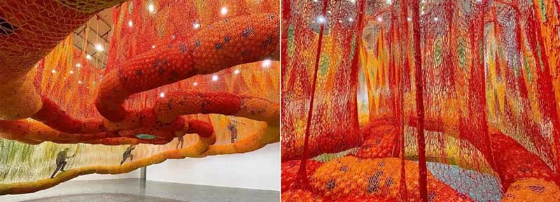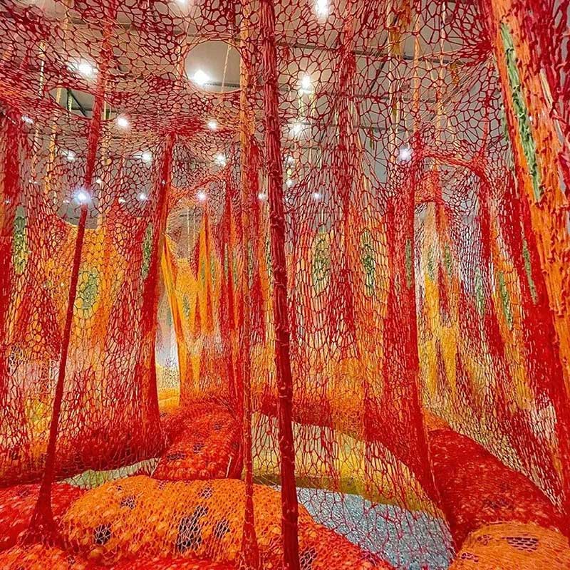 在近30英尺x 79英尺x 55英尺的高度,「ernesto neto:SunForceOceanLife」被懸掛在天花板上,以各種各樣的圖案歡迎游客。當(dāng)游客進(jìn)入時(shí),他們會(huì)被引導(dǎo)穿過一條小路,在這條小路上,每個(gè)鉤針部分都裝滿了塑料球,迫使他們專注于內(nèi)在的平衡和穩(wěn)定性。迷宮邀請(qǐng)人們?cè)?2英尺高的空中探索。藝術(shù)裝置還將藝術(shù)和文化與生物學(xué)和宇宙學(xué)都結(jié)合起來,讓我們好好放松,呼吸。