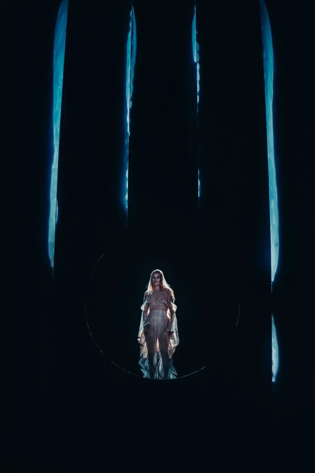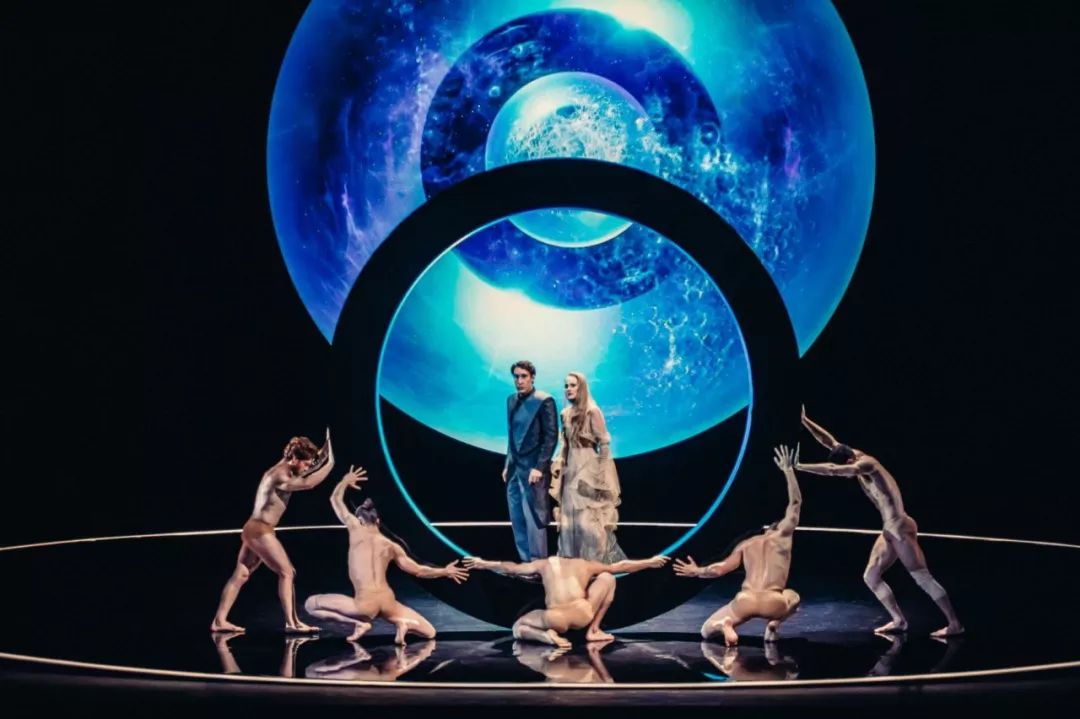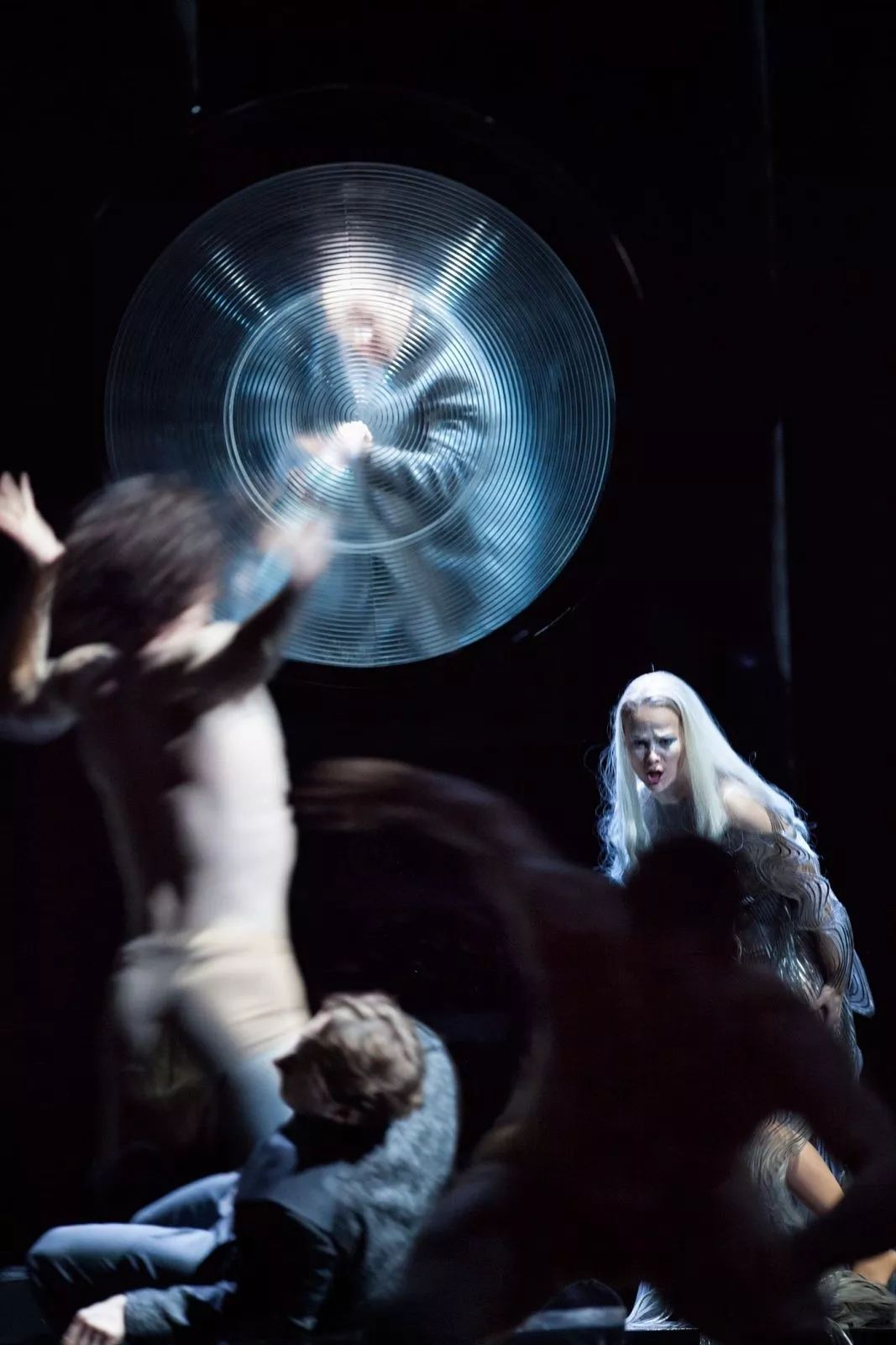 設(shè)計(jì)靈感來自許多提到”看”和”被看到”,以及反復(fù)出現(xiàn)的光主題,無論是地球——燈塔、燈,還是宇宙——太陽、月亮、星星——、切爾卡維、賈萊特和阿布拉莫維奇,整個歌劇都設(shè)置在一個黑色的球形空間中。