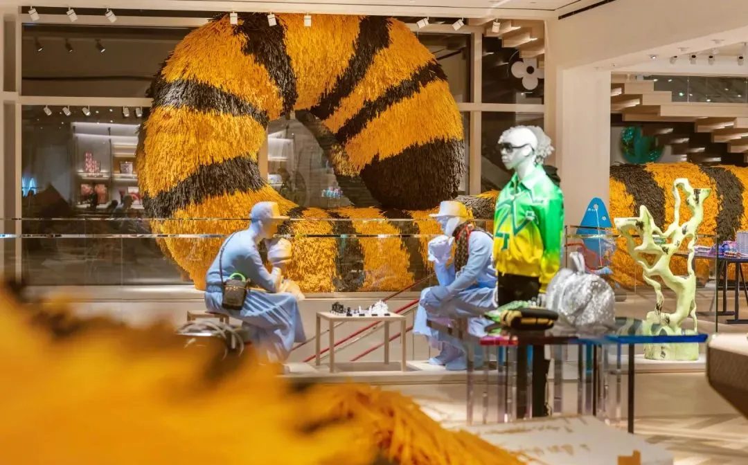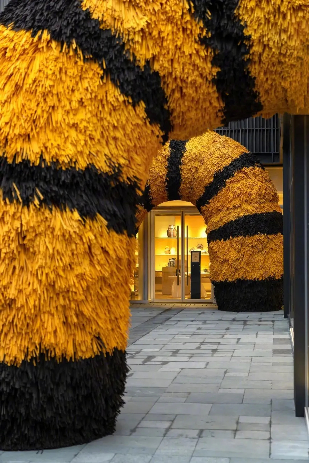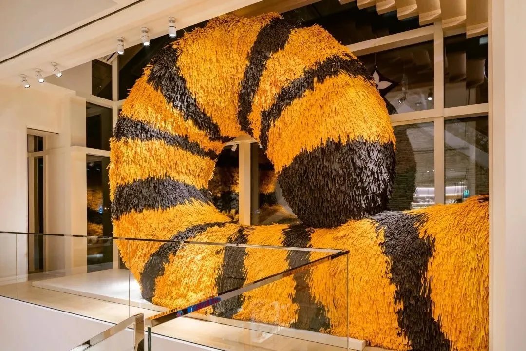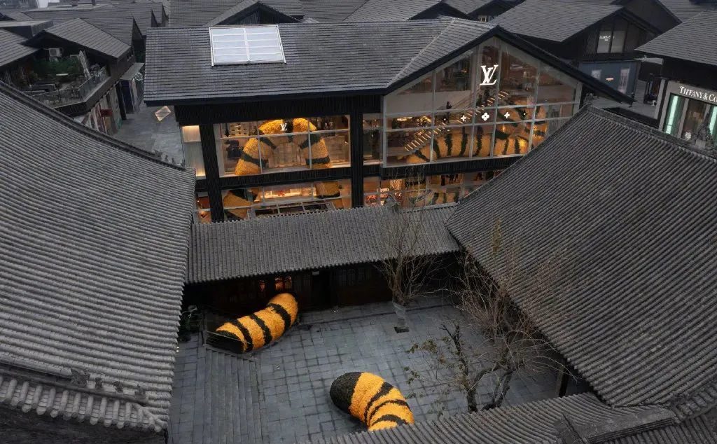 這條巨型老虎尾巴位于成都遠洋太古里,是LV為迎接虎年特意制作的藝術(shù)裝置,從俯視的角度看巨型老虎尾巴好似在建筑間游走。從大門到庭院,又一直盤旋到頂層閣樓,無論哪個角度看都相當?shù)恼鸷场?/p>
