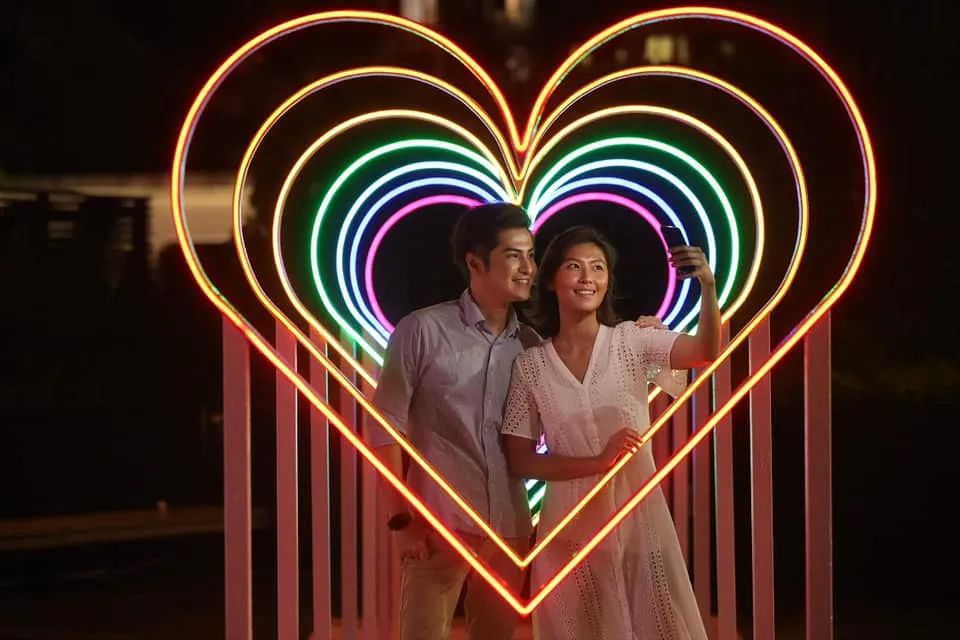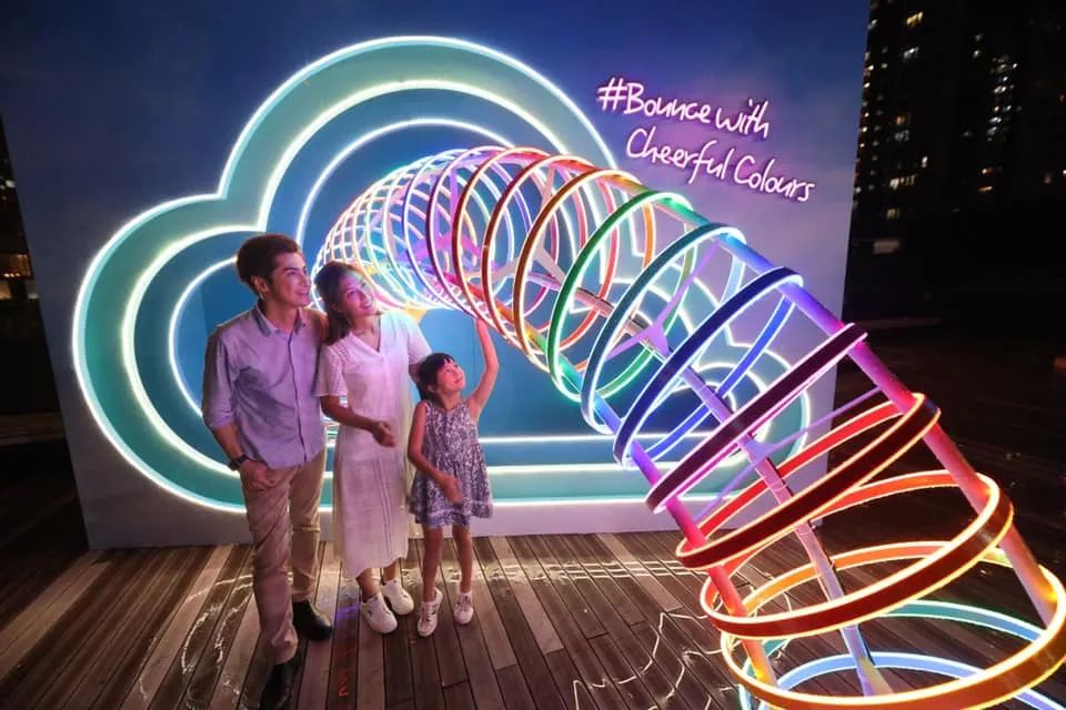 一圈圈的七彩彈弓仿佛幻化成飛云駕霧的天梯,踏上云端后會否Fly Me To TheMoon,讓大家近距離看見高掛的明月?快拉著同伴的手進入這「夢幻云霧彩虹相框」,在云與七彩彈弓之間游走嬉戲,享受月光滿瀉的幸福好時光。旁邊用霓虹燈造成的字句,亦與打卡位互相呼應(yīng),讓人看過后會心微笑!