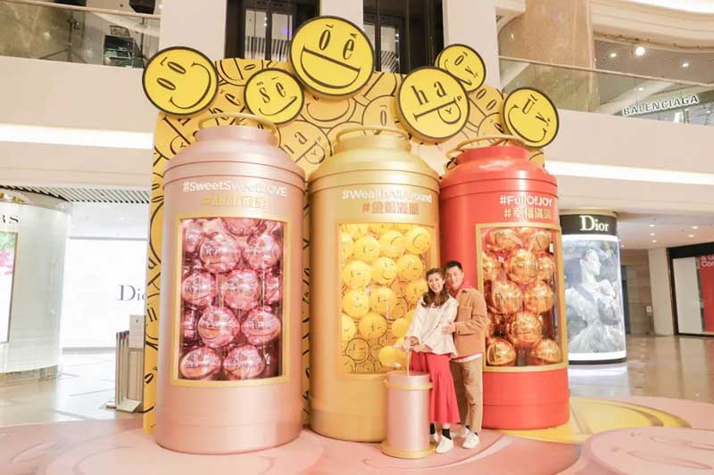 而旁邊的巨型互動打氣專區(qū)亦毫不遜色,三個代表「甜甜蜜蜜」、「金銀滿屋」及「幸福滿滿」的打氣筒內(nèi)分別裝滿以「LOVED」、「LUCKY」及kissmiklos特意為此企劃設(shè)計的「FULL」emograms,只要按下打氣筒前的打氣裝置,「金銀滿屋」打氣筒便會立即充滿元氣,多個「LUCKY」emograms將于筒內(nèi)翻滾流動,寓意好運和金銀一同翻滾而來!
