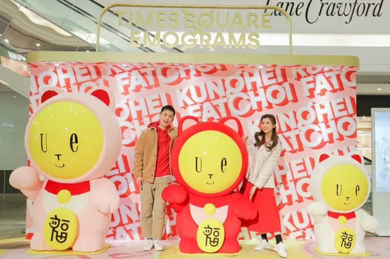 巨型打氣筒對面正是高達(dá)兩米的招財貓藝術(shù)裝置,設(shè)計師kissmiklos破天荒地為emograms換上首個非球狀,而且充滿新年氣氛的「招財貓」新裝,三個大小不一、毛茸茸的招財貓身上印有由kissmiklos為是次企劃特別設(shè)計而成的「福」字,站在印有寓意為「恭喜發(fā)財」的「KUNGHEIFATCHOI」巨型布景板前,乖巧地等待著你與它們拍照打卡,把滿滿的財運傳送給你!