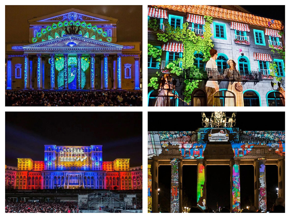 說明3D Mapping之建筑投影:是采用投影畫面平鋪在建筑表面的一種表現(xiàn)形式。通過光線的投射,打破物理空間,實現(xiàn)了建筑體與視頻動畫的完美結合,從而產(chǎn)生了強烈的視覺沖擊力。這種表現(xiàn)形式跨越了多個學科,例如:劇本創(chuàng)作,三維動畫制作,光學,建筑學等。