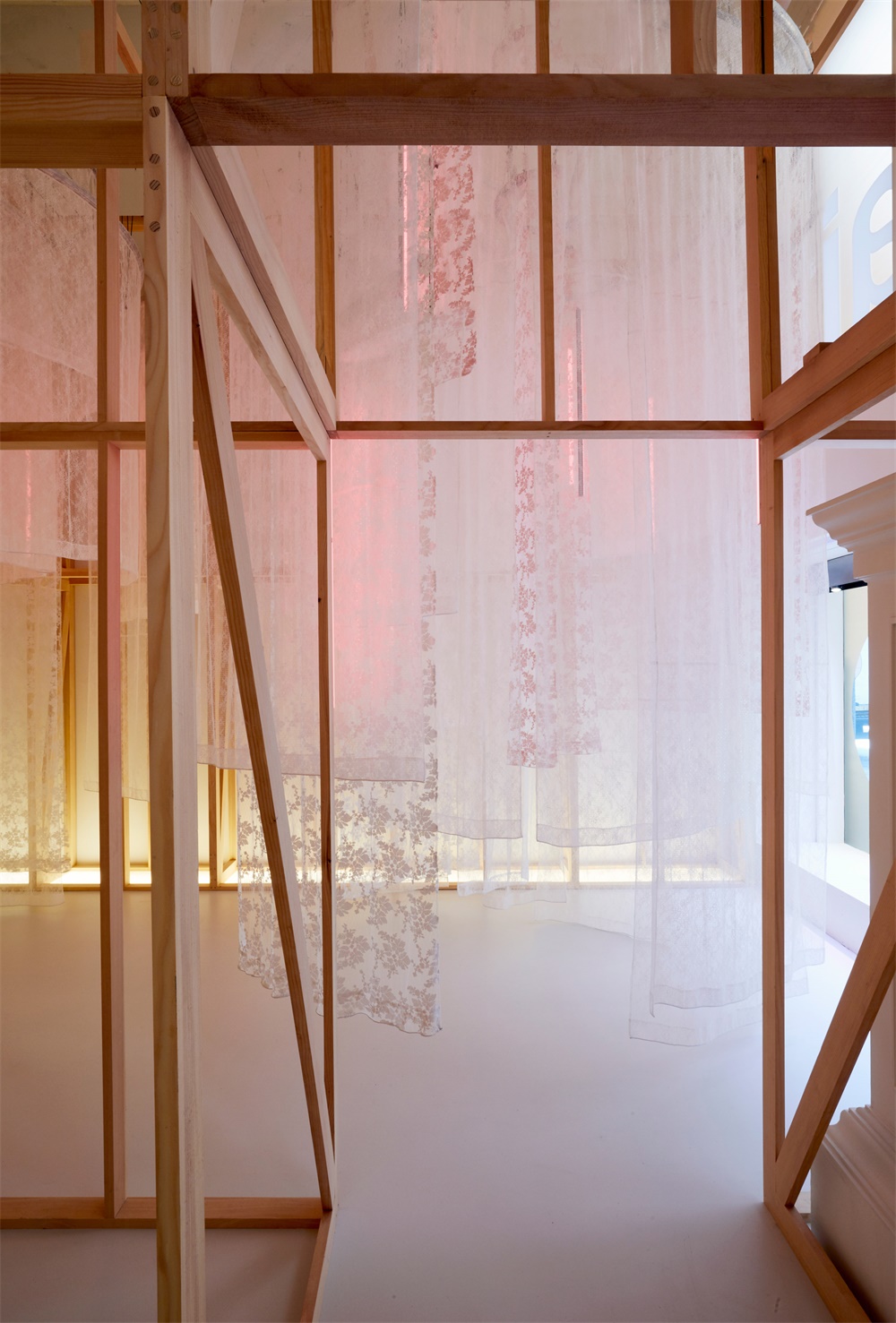 粉色和白色蕾絲薄板被懸掛在不同的長(zhǎng)度上,并排列成一個(gè)松散的同心圓–最里面的環(huán)中的蕾絲面板的長(zhǎng)度最短,使游客可以輕松通過(guò)下方。保持蕾絲的弧形面板上,每張紙都縫在彎曲的金屬桿上,通過(guò)拉力繩固定在商店兩側(cè)的巨大木框架上。