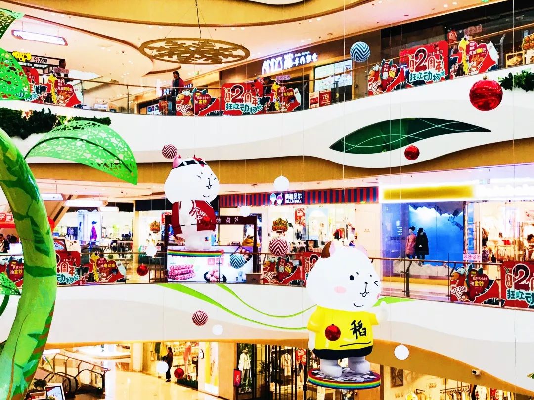 搖曳在中空的五小神公仔,以暖萌、輕盈的形象展示給商場往來群體,加以五彩繽紛的圣誕球點綴,為繁花似錦的商業(yè)區(qū)帶來輕松愉悅的圣誕節(jié)日氛圍,仿佛置身王牌御鼠童話般的世界,感受一個充滿國風(fēng)的國潮圣誕。